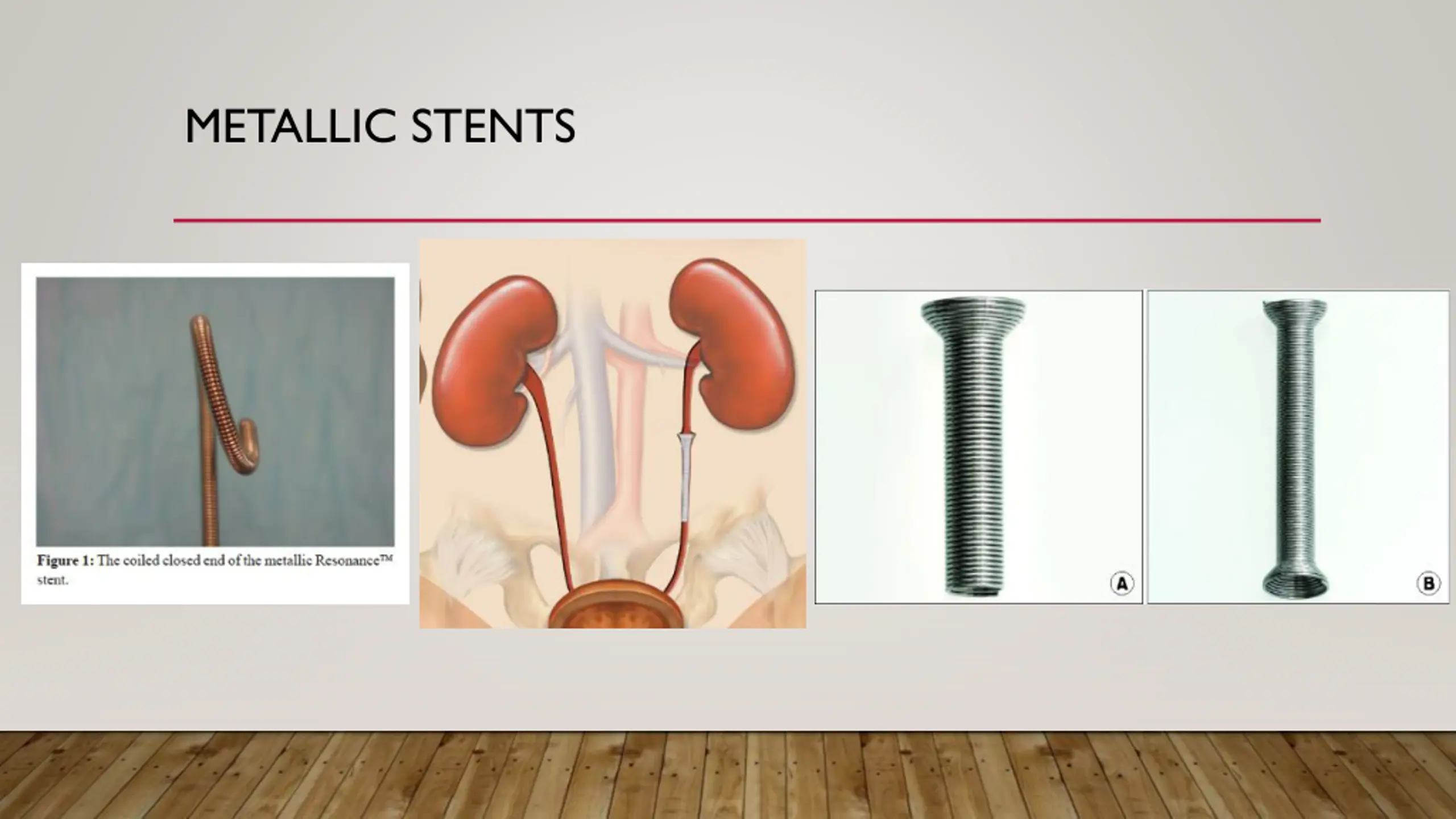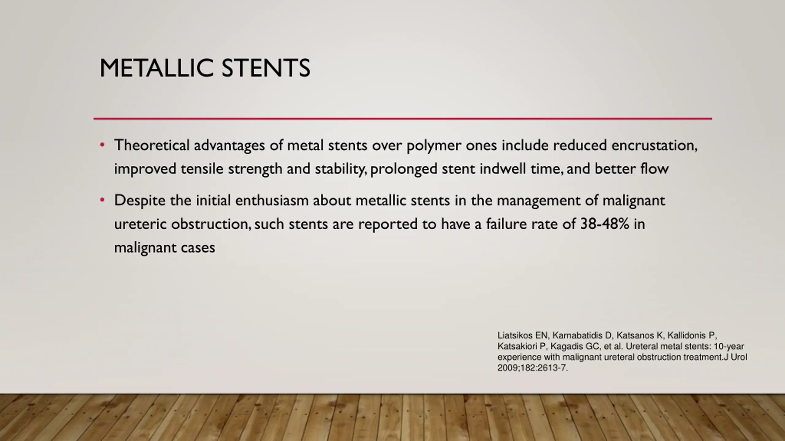 METALLIC STENTS Theoretical advantages of metal stents over polymer ones include reduced encrustation, improved tensile strength and stability, prolonged stent indwell time, and better flow Despite the initial enthusiasm about metallic stents in the management of malignant ureteric obstruction, such stents are reported to have a failure rate of 38-48% in malignant cases Liatsikos EN, Karnabatidis D, Katsanos K, Kallidonis P, Katsakiori P, Kagadis GC, et al. Ureteral metal stents: 10-year experience with malignant ureteral obstruction treatment.J Urol 2009;182:2613-7.