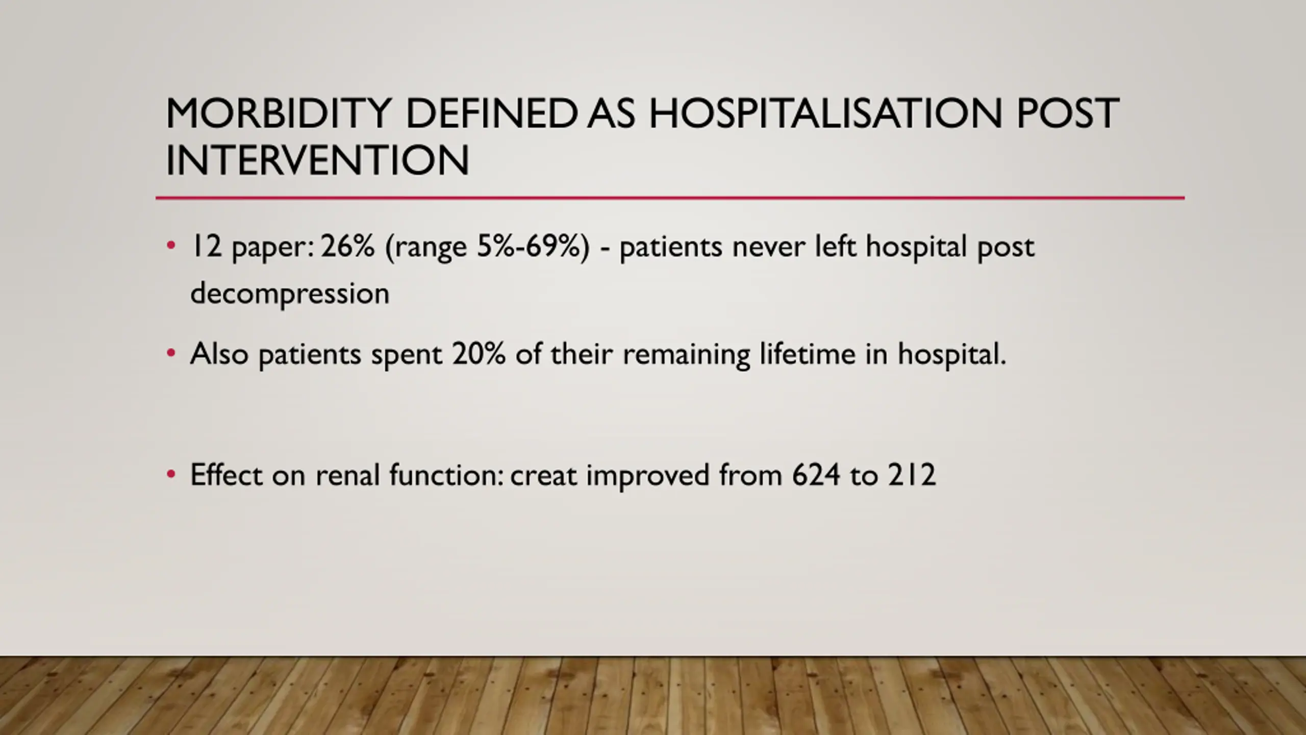 MORBIDITY DEFINED AS HOSPITALISATION POST INTERVENTION 12 paper: 26% (range 5%-69%) - patients never left hospital post decompression Also patients spent 20% of their remaining lifetime in hospital. Effect on renal function: creat improved from 624 to 212