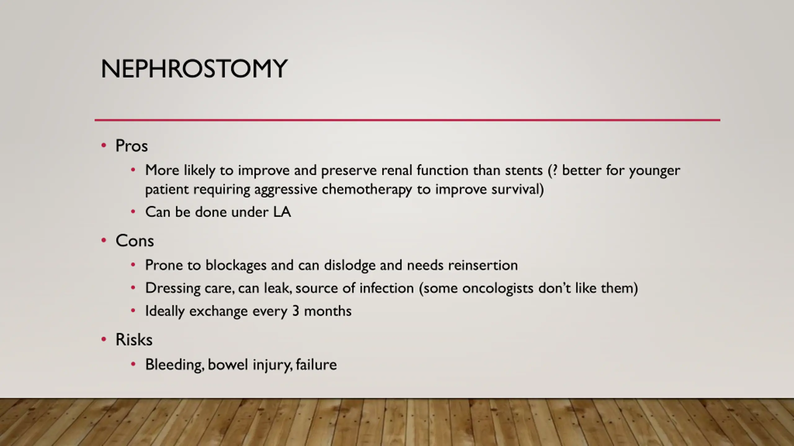 NEPHROSTOMY Pros More likely to improve and preserve renal function than stents (? better for younger patient requiring aggressive chemotherapy to improve survival) Can be done under LA Cons Prone to blockages and can dislodge and needs reinsertion Dressing care, can leak, source of infection (some oncologists don t like them) Ideally exchange every 3 months Risks Bleeding, bowel injury, failure
