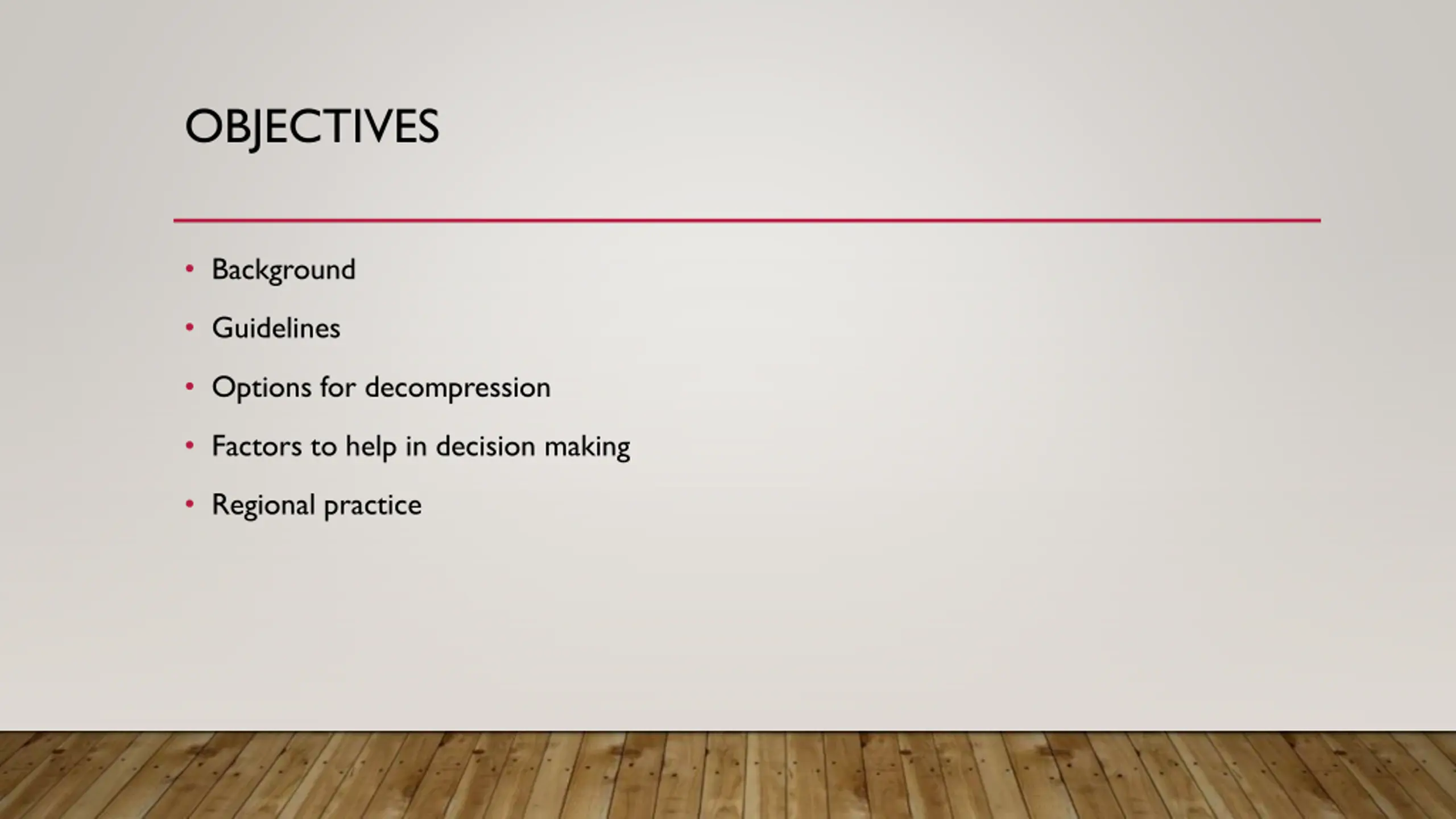 OBJECTIVES Background Guidelines Options for decompression Factors to help in decision making Regional practice