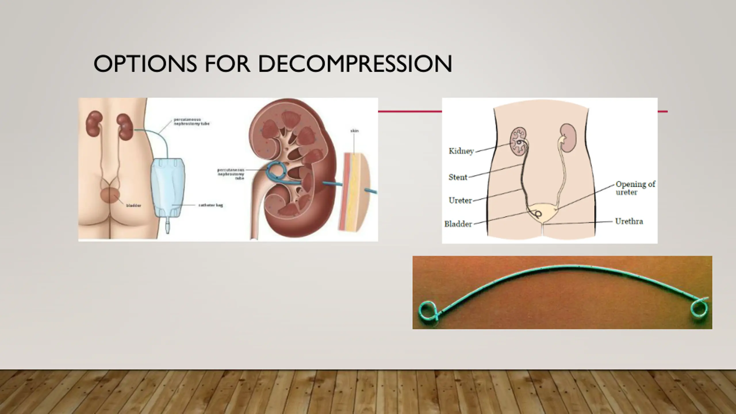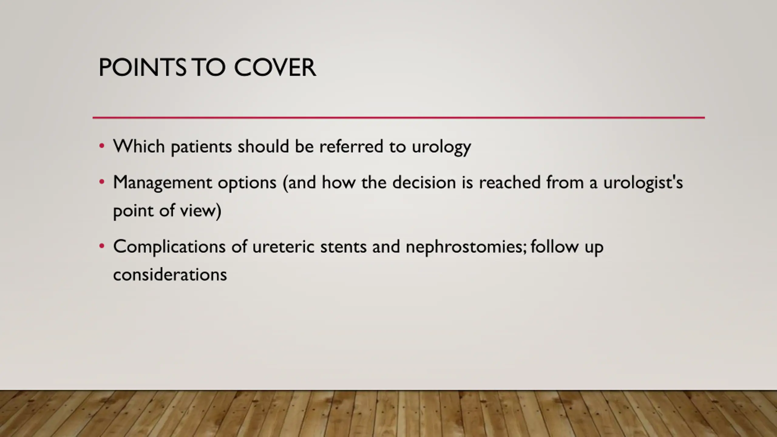 POINTS TO COVER Which patients should be referred to urology Management options (and how the decision is reached from a urologist's point of view) Complications of ureteric stents and nephrostomies; follow up considerations
