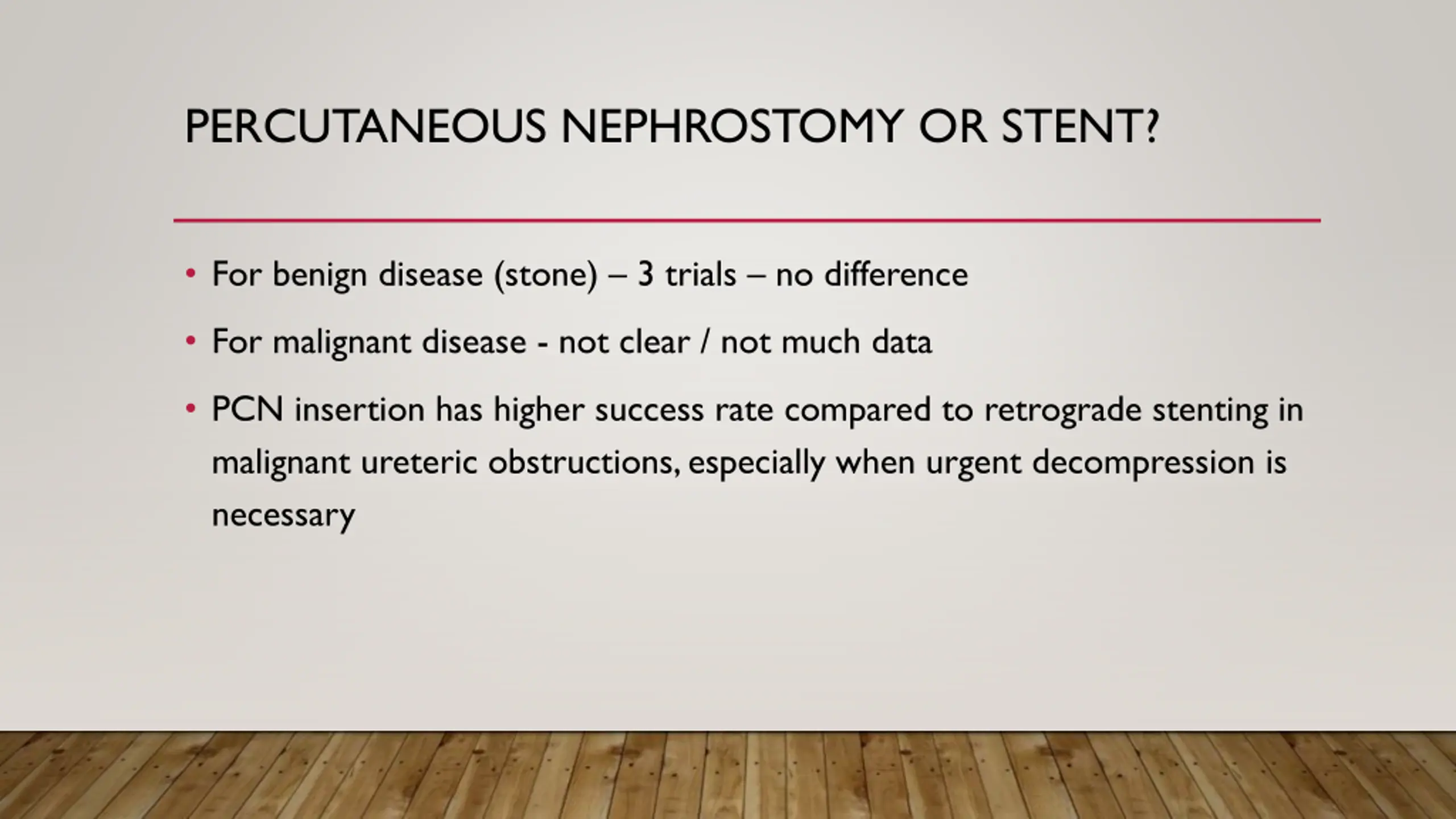 PERCUTANEOUS NEPHROSTOMY OR STENT? For benign disease (stone) 3 trials no difference For malignant disease - not clear / not much data PCN insertion has higher success rate compared to retrograde stenting in malignant ureteric obstructions, especially when urgent decompression is necessary