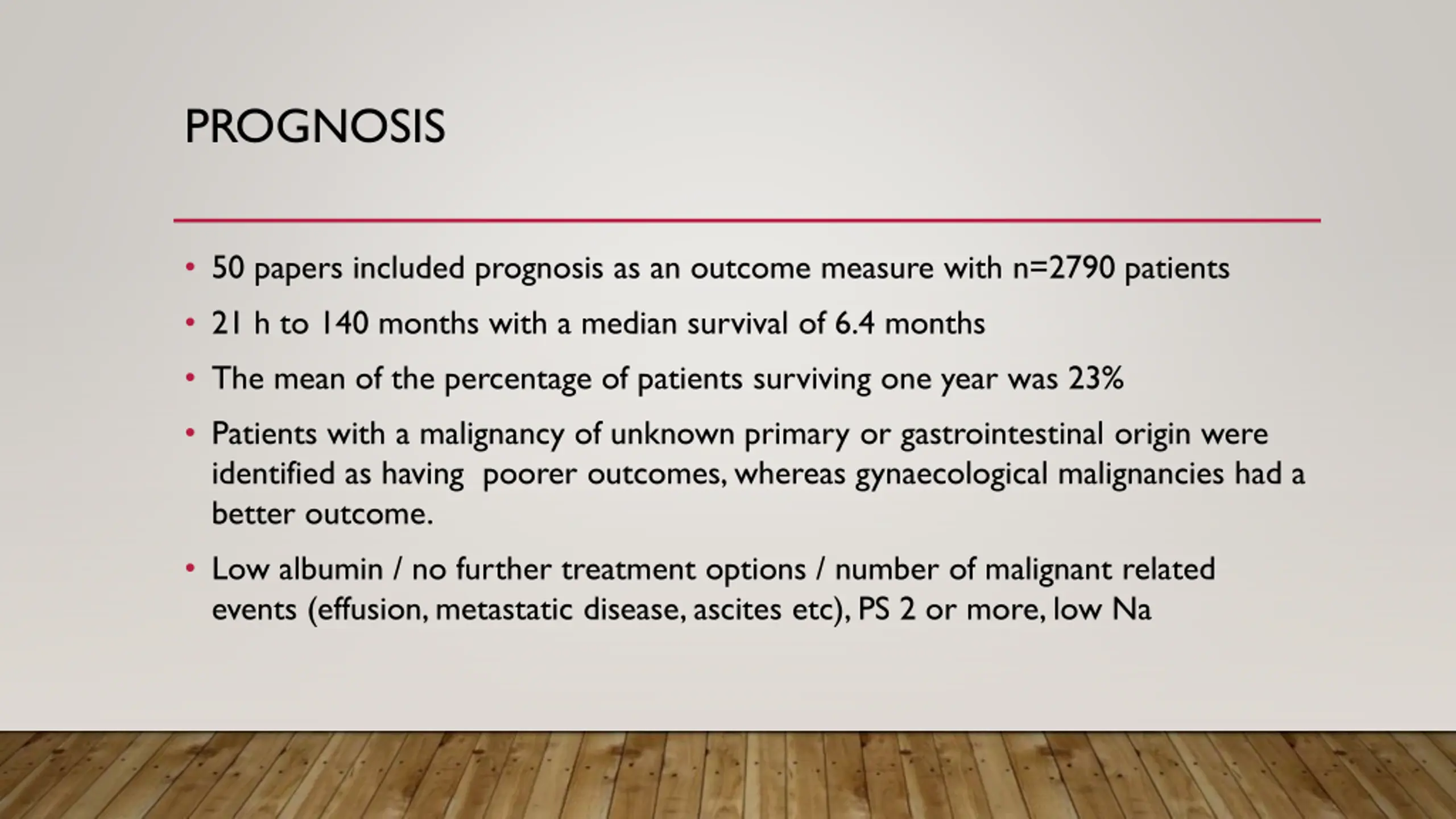 PROGNOSIS 50 papers included prognosis as an outcome measure with n=2790 patients 21 h to 140 months with a median survival of 6.4 months The mean of the percentage of patients surviving one year was 23% Patients with a malignancy of unknown primary or gastrointestinal origin were identified as having poorer outcomes, whereas gynaecological malignancies had a better outcome. Low albumin / no further treatment options / number of malignant related events (effusion, metastatic disease, ascites etc), PS 2 or more, low Na
