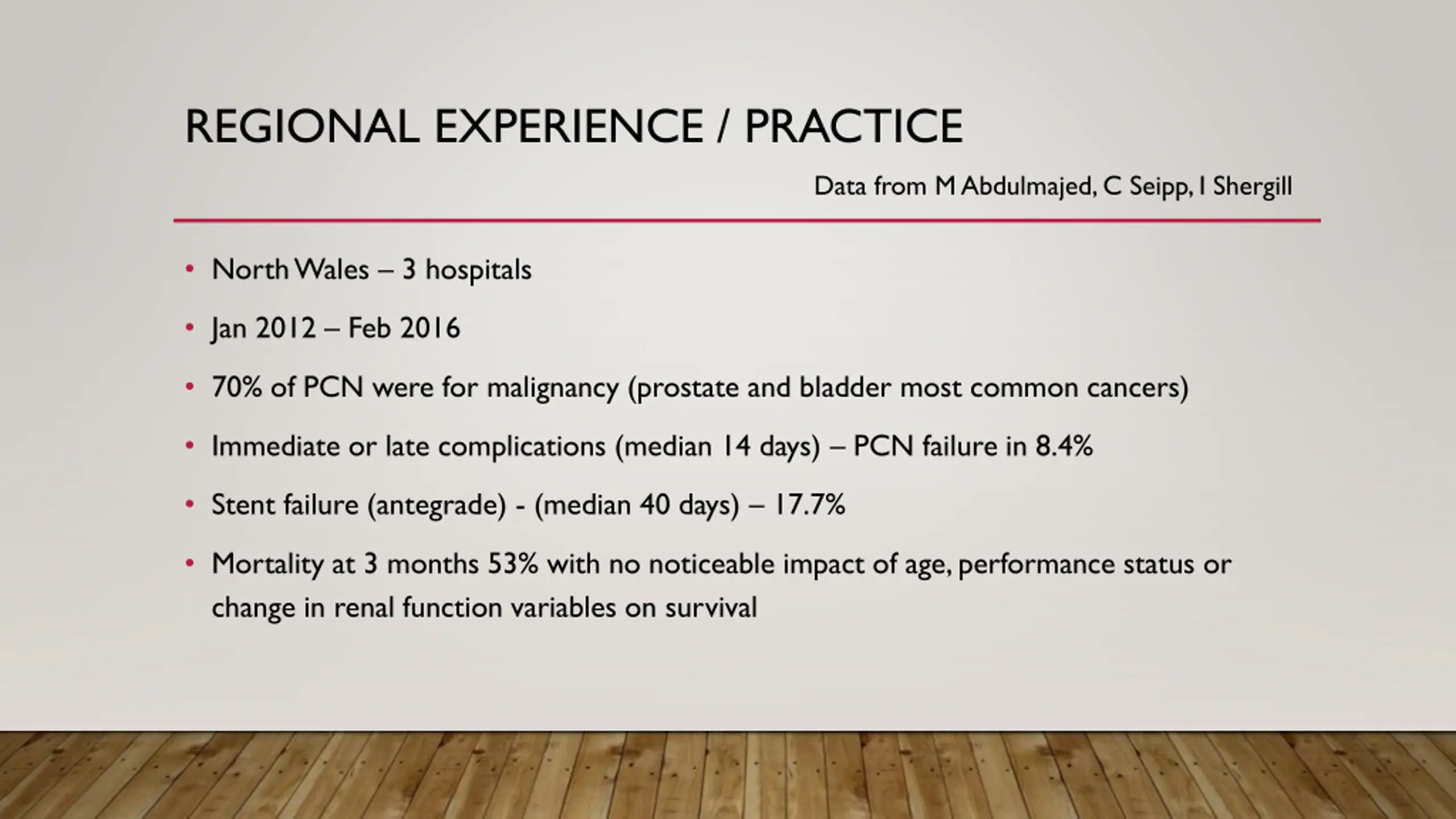 REGIONAL EXPERIENCE / PRACTICE Data from M Abdulmajed, C Seipp, I Shergill North Wales 3 hospitals Jan 2012 Feb 2016 70% of PCN were for malignancy (prostate and bladder most common cancers) Immediate or late complications (median 14 days) PCN failure in 8.4% Stent failure (antegrade) - (median 40 days) 17.7% Mortality at 3 months 53% with no noticeable impact of age, performance status or change in renal function variables on survival