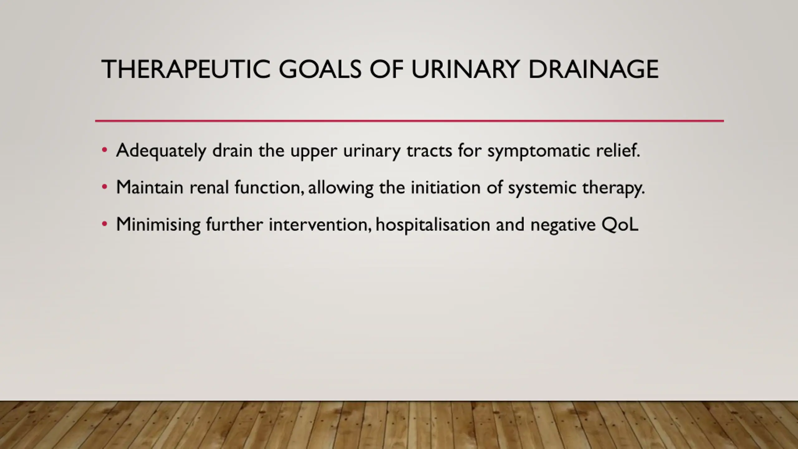 THERAPEUTIC GOALS OF URINARY DRAINAGE Adequately drain the upper urinary tracts for symptomatic relief. Maintain renal function, allowing the initiation of systemic therapy. Minimising further intervention, hospitalisation and negative QoL