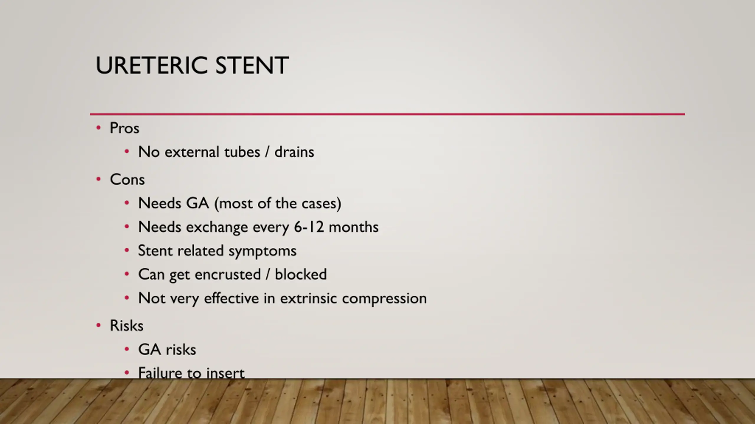 URETERIC STENT Pros No external tubes / drains Cons Needs GA (most of the cases) Needs exchange every 6-12 months Stent related symptoms Can get encrusted / blocked Not very effective in extrinsic compression Risks GA risks Failure to insert