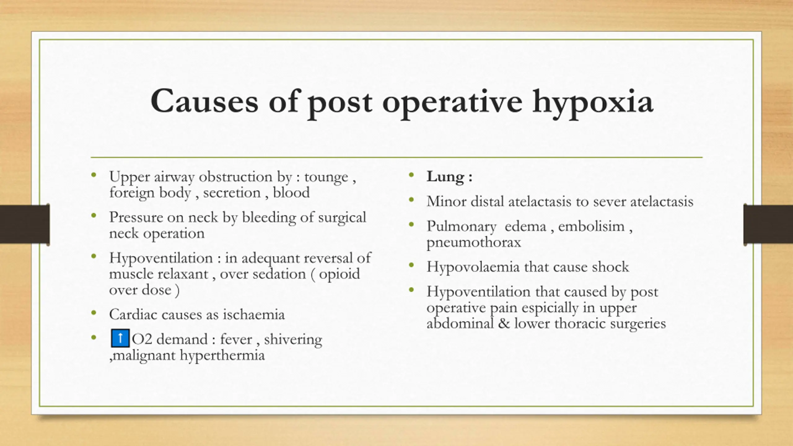 Causes of post operative hypoxia Upper airway obstruction by : tounge , foreign body , secretion , blood Pressure on neck by bleeding of surgical neck operation Hypoventilation : in adequant reversal of muscle relaxant , over sedation ( opioid over dose ) Cardiac causes as ischaemia O2 demand : fever , shivering ,malignant hyperthermia Lung : Minor distal atelactasis to sever atelactasis Pulmonary edema , embolisim , pneumothorax Hypovolaemia that cause shock Hypoventilation that caused by post operative pain espicially in upper abdominal & lower thoracic surgeries
