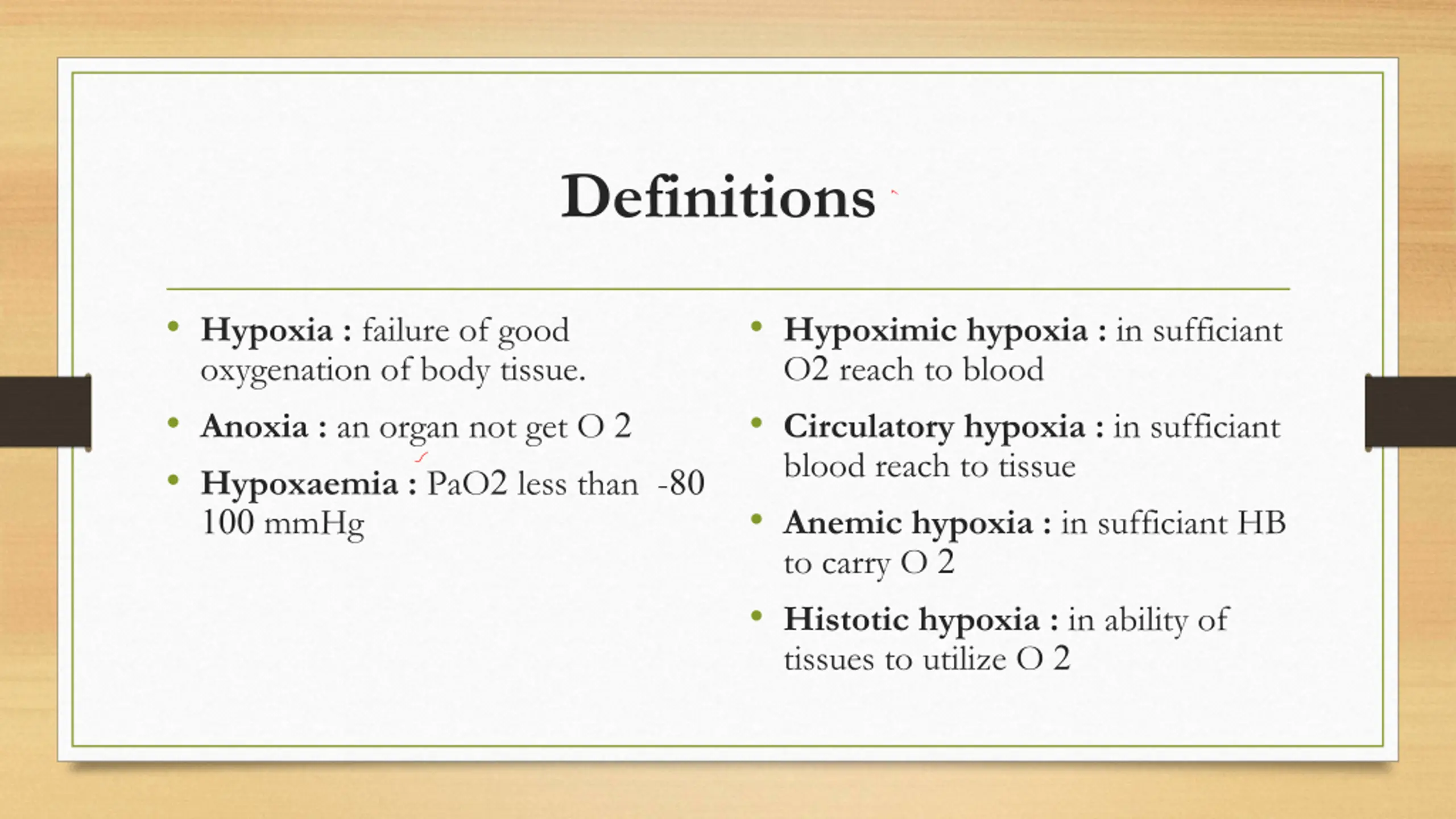 Definitions Hypoxia : failure of good oxygenation of body tissue. Anoxia : an organ not get O 2 Hypoxaemia : PaO2 less than 80 100 mmHg Hypoximic hypoxia : in sufficiant O2 reach to blood Circulatory hypoxia : in sufficiant blood reach to tissue Anemic hypoxia : in sufficiant HB to carry O 2 Histotic hypoxia : in ability of tissues to utilize O 2 -