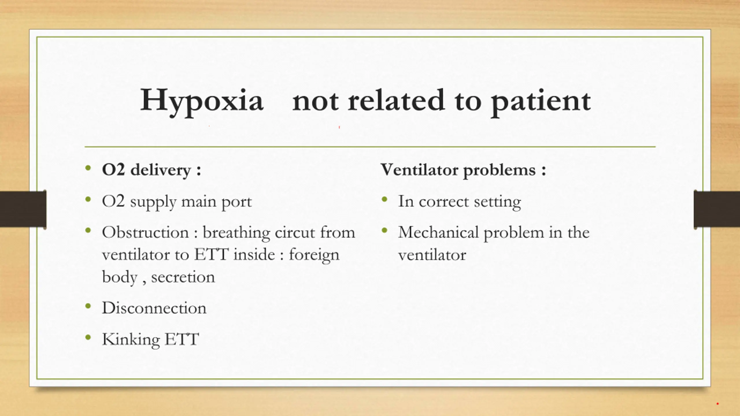 Hypoxia not related to patient O2 delivery : O2 supply main port Obstruction : breathing circut from ventilator to ETT inside : foreign body , secretion Disconnection Kinking ETT Ventilator problems : In correct setting Mechanical problem in the ventilator