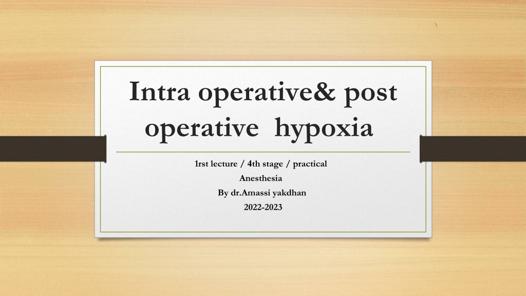 Hypoxia in the intra-operative and post-operative stages can be caused by various factors related to oxygen delivery, patient conditions, and anesthesia management. Understanding the definitions of hypoxia, its types, and causes is crucial for effective management. This includes recognizing hypoxia not related to patient oxygen delivery, patient-related causes like bronchospasm and atelectasis, and strategies for prevention and treatment during surgery. Learn about clinical signs, prevention measures, and management techniques to address hypoxia promptly and ensure patient safety in the operating room.