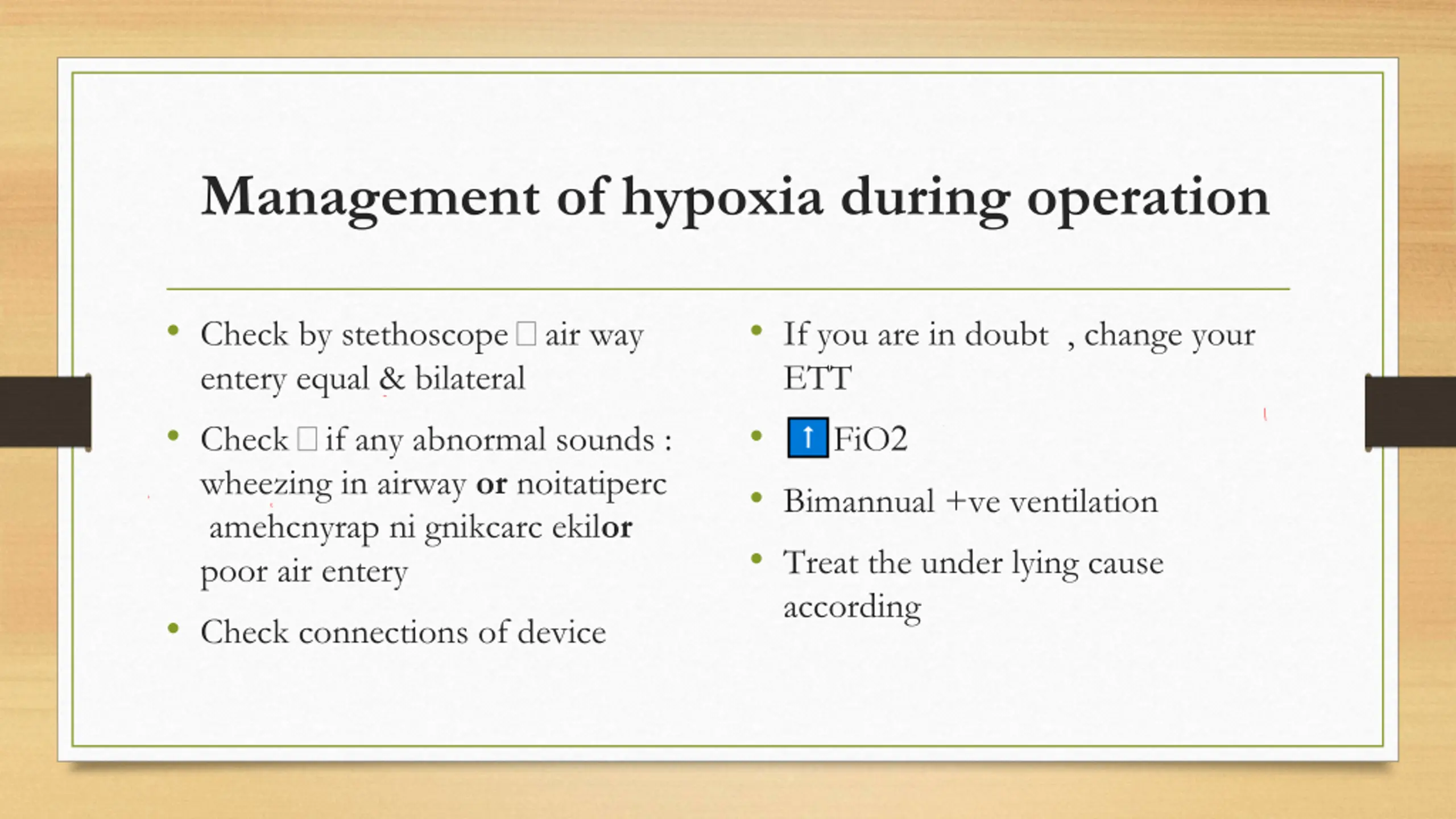 Management of hypoxia during operation Check by stethoscope air way entery equal & bilateral Check if any abnormal sounds : wheezing in airway or noitatiperc amehcnyrap ni gnikcarc ekilor poor air entery Check connections of device If you are in doubt , change your ETT FiO2 Bimannual +ve ventilation Treat the under lying cause according