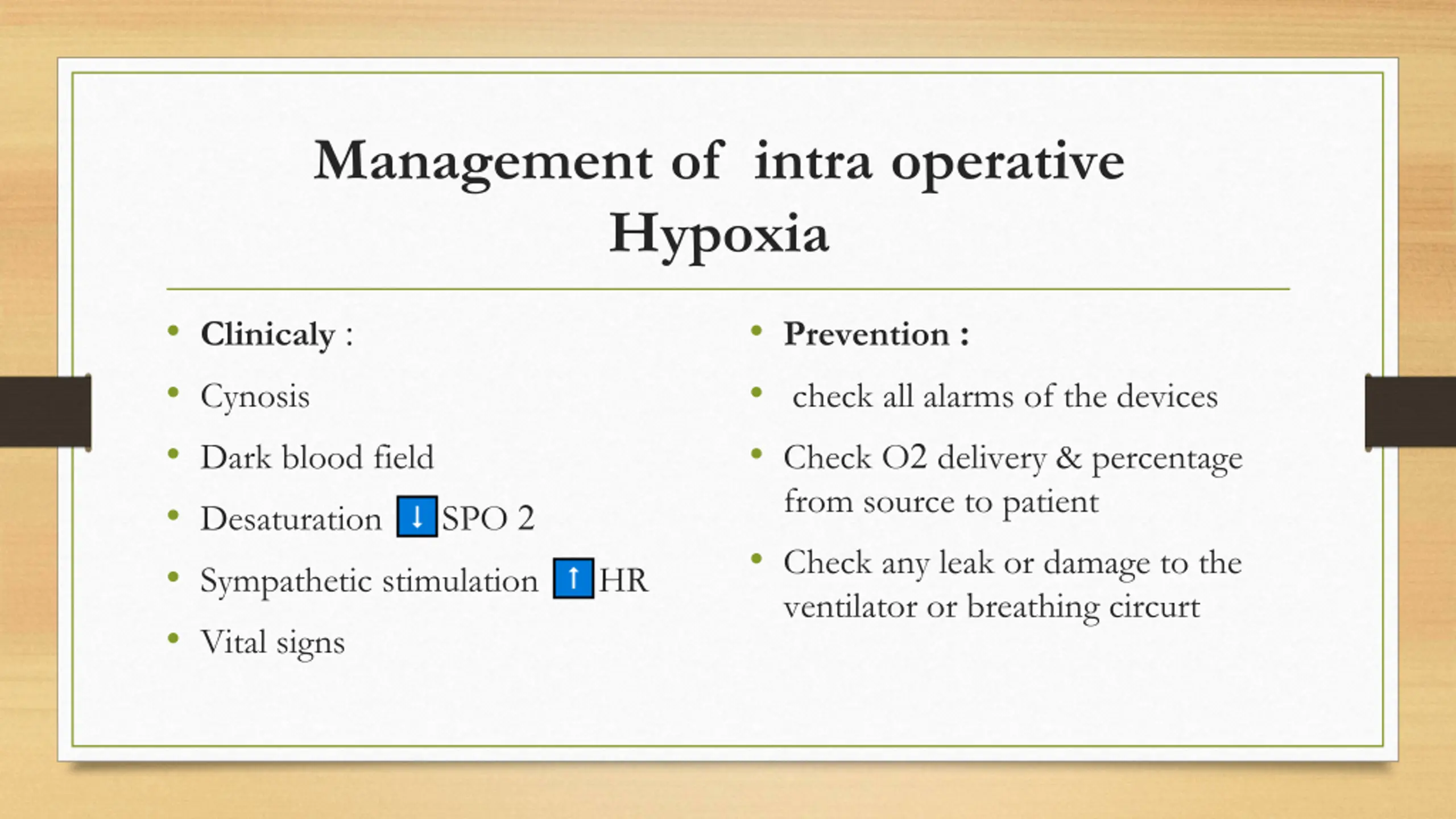 Management of intra operative Hypoxia Clinicaly : Cynosis Dark blood field Desaturation Sympathetic stimulation Vital signs Prevention : check all alarms of the devices Check O2 delivery & percentage from source to patient Check any leak or damage to the ventilator or breathing circurt SPO 2 HR