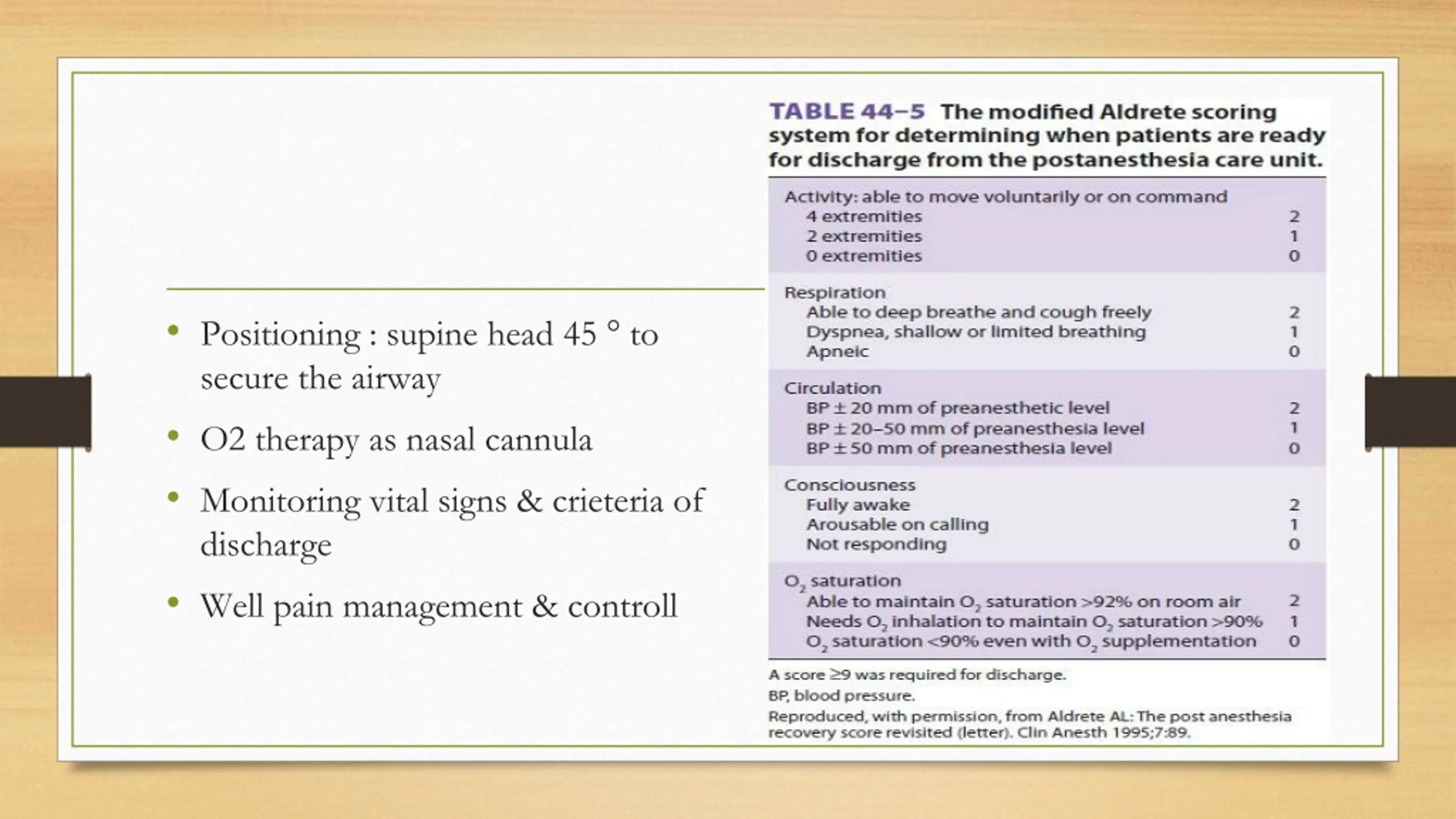 Positioning : supine head 45 to secure the airway O2 therapy as nasal cannula Monitoring vital signs & crieteria of discharge Well pain management & controll