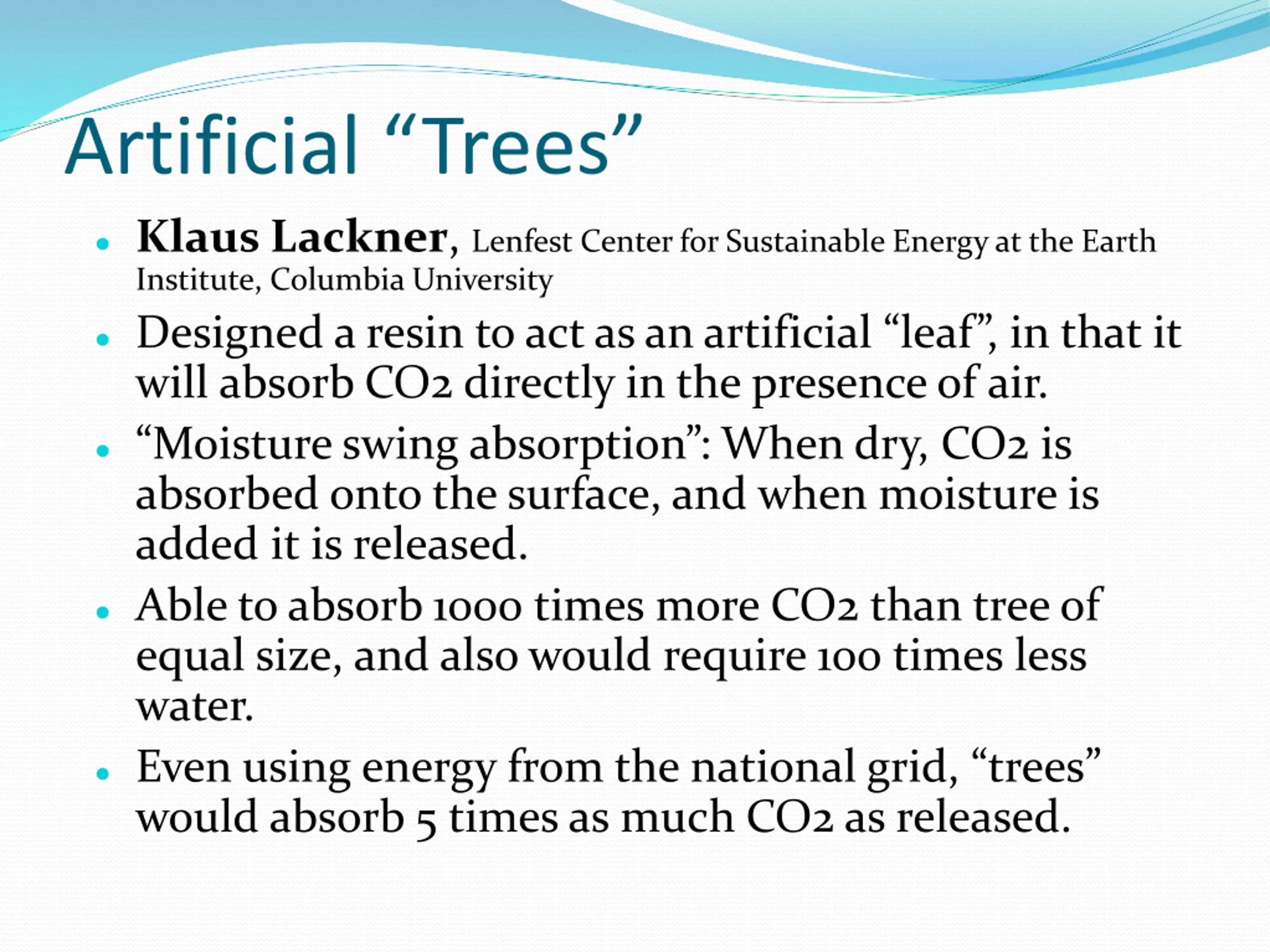 Artificial Trees Klaus Lackner, Lenfest Center for Sustainable Energy at the Earth Institute, Columbia University Designed a resin to act as an artificial leaf , in that it will absorb CO2 directly in the presence of air. Moisture swing absorption : When dry, CO2 is absorbed onto the surface, and when moisture is added it is released. Able to absorb 1000 times more CO2 than tree of equal size, and also would require 100 times less water. Even using energy from the national grid, trees would absorb 5 times as much CO2 as released.