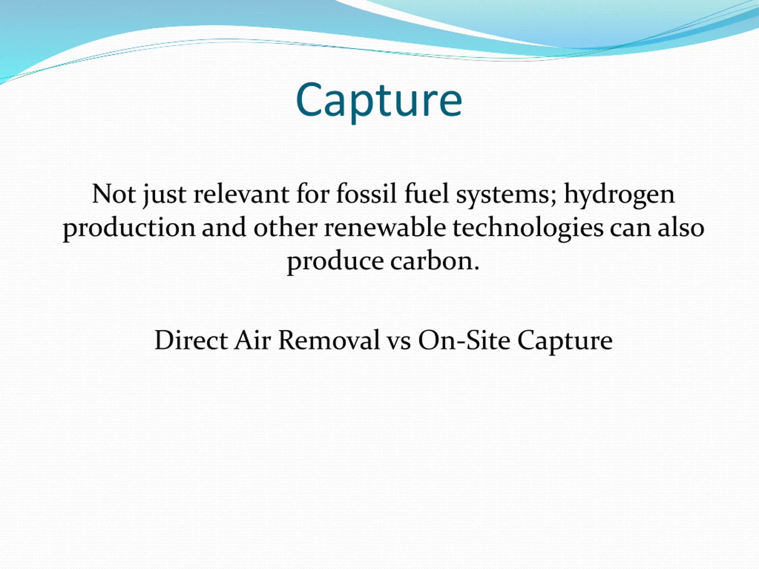 Capture Not just relevant for fossil fuel systems; hydrogen production and other renewable technologies can also produce carbon. Direct Air Removal vs On-Site Capture
