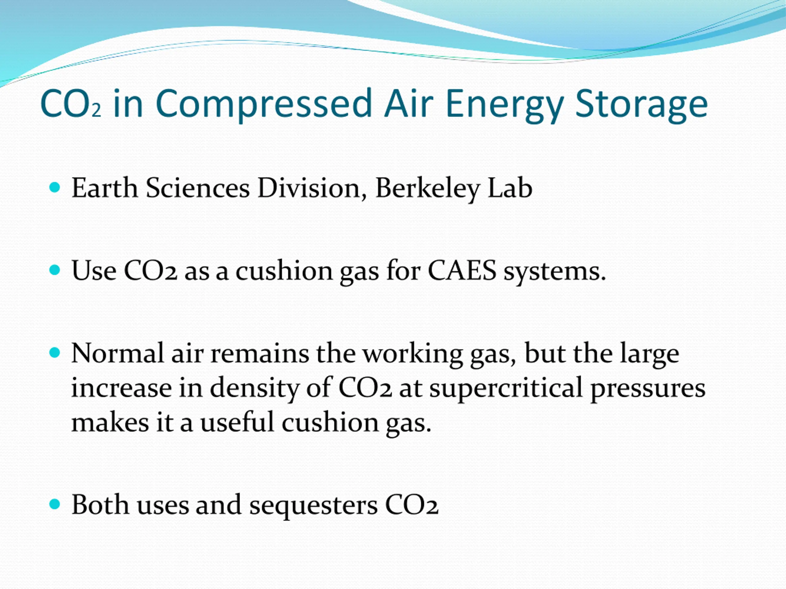 CO2 in Compressed Air Energy Storage Earth Sciences Division, Berkeley Lab Use CO2 as a cushion gas for CAES systems. Normal air remains the working gas, but the large increase in density of CO2 at supercritical pressures makes it a useful cushion gas. Both uses and sequesters CO2