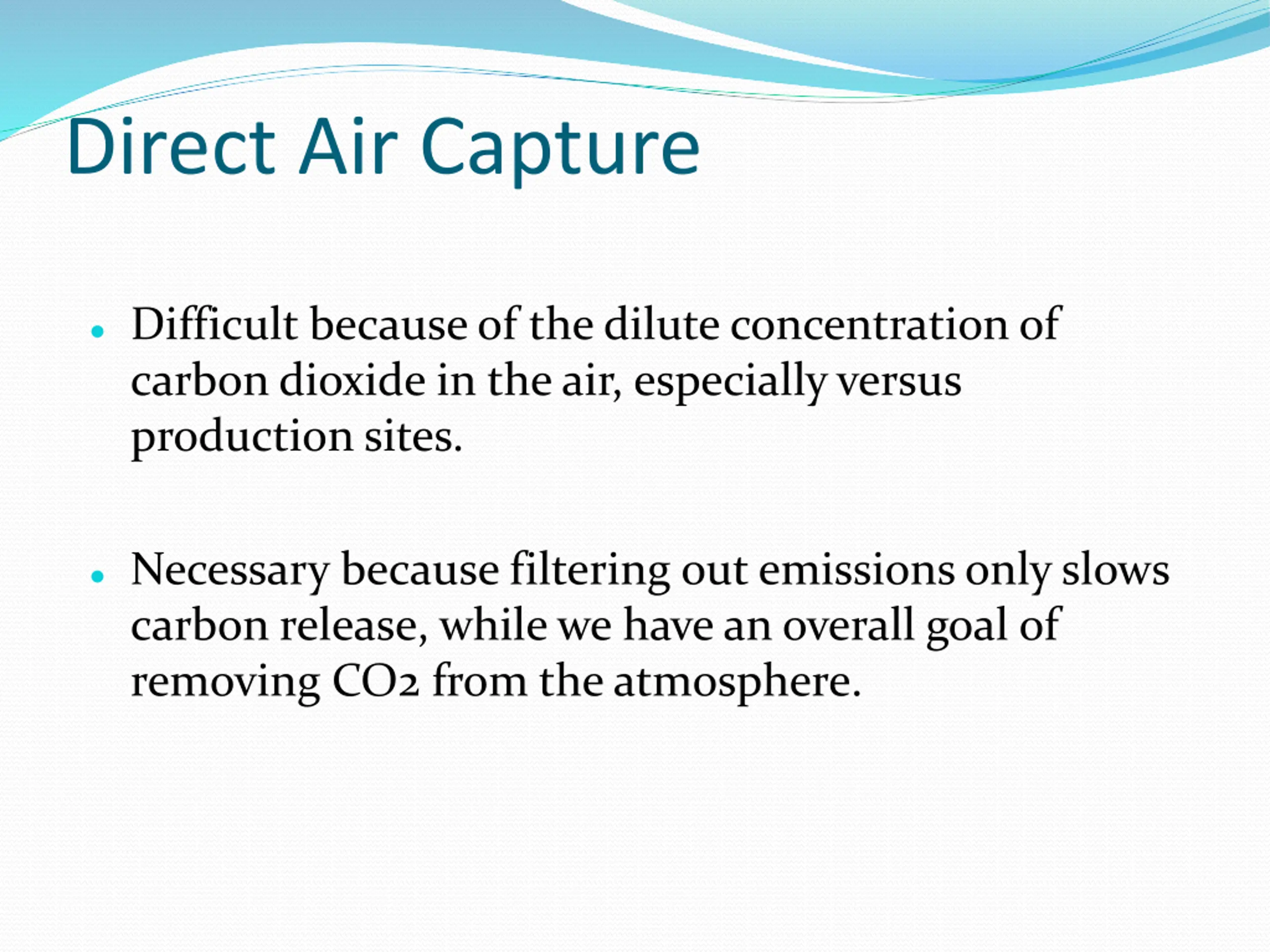 Direct Air Capture Difficult because of the dilute concentration of carbon dioxide in the air, especially versus production sites. Necessary because filtering out emissions only slows carbon release, while we have an overall goal of removing CO2 from the atmosphere.