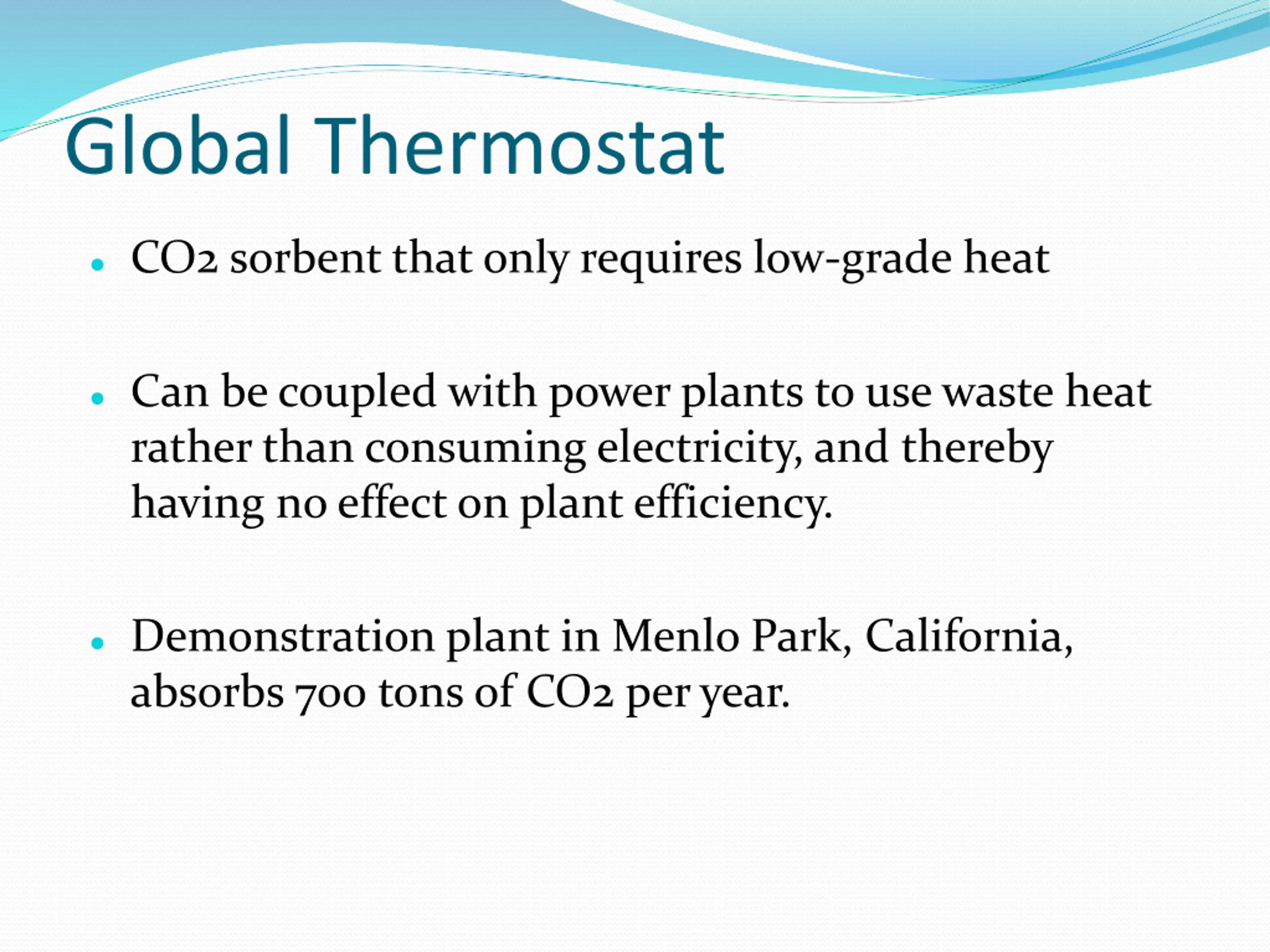 Global Thermostat CO2 sorbent that only requires low-grade heat Can be coupled with power plants to use waste heat rather than consuming electricity, and thereby having no effect on plant efficiency. Demonstration plant in Menlo Park, California, absorbs 700 tons of CO2 per year.