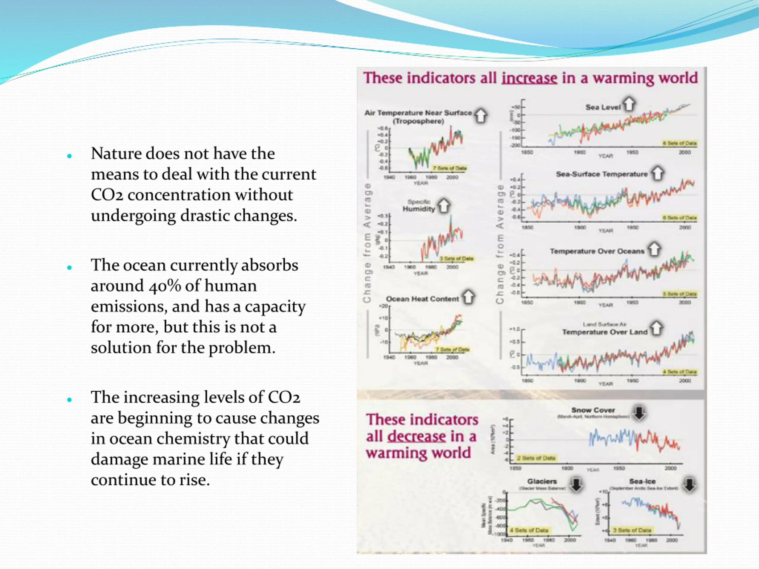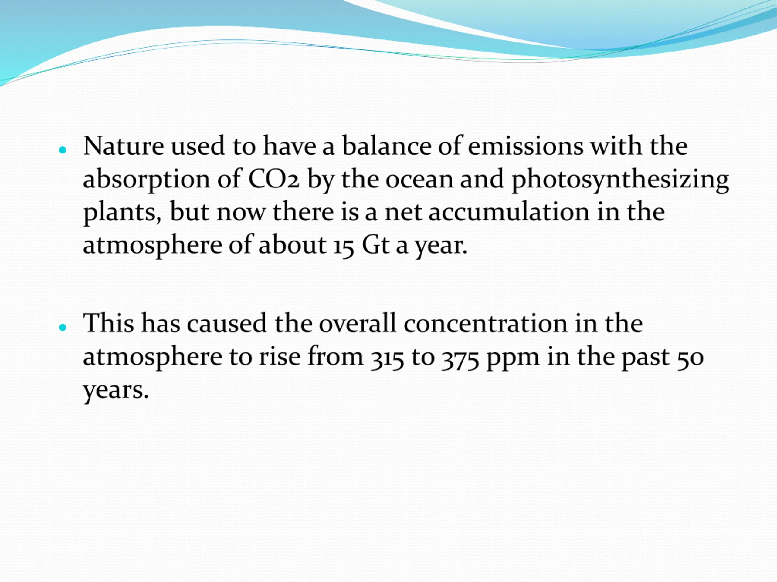 Nature used to have a balance of emissions with the absorption of CO2 by the ocean and photosynthesizing plants, but now there is a net accumulation in the atmosphere of about 15 Gt a year. This has caused the overall concentration in the atmosphere to rise from 315 to 375 ppm in the past 50 years.