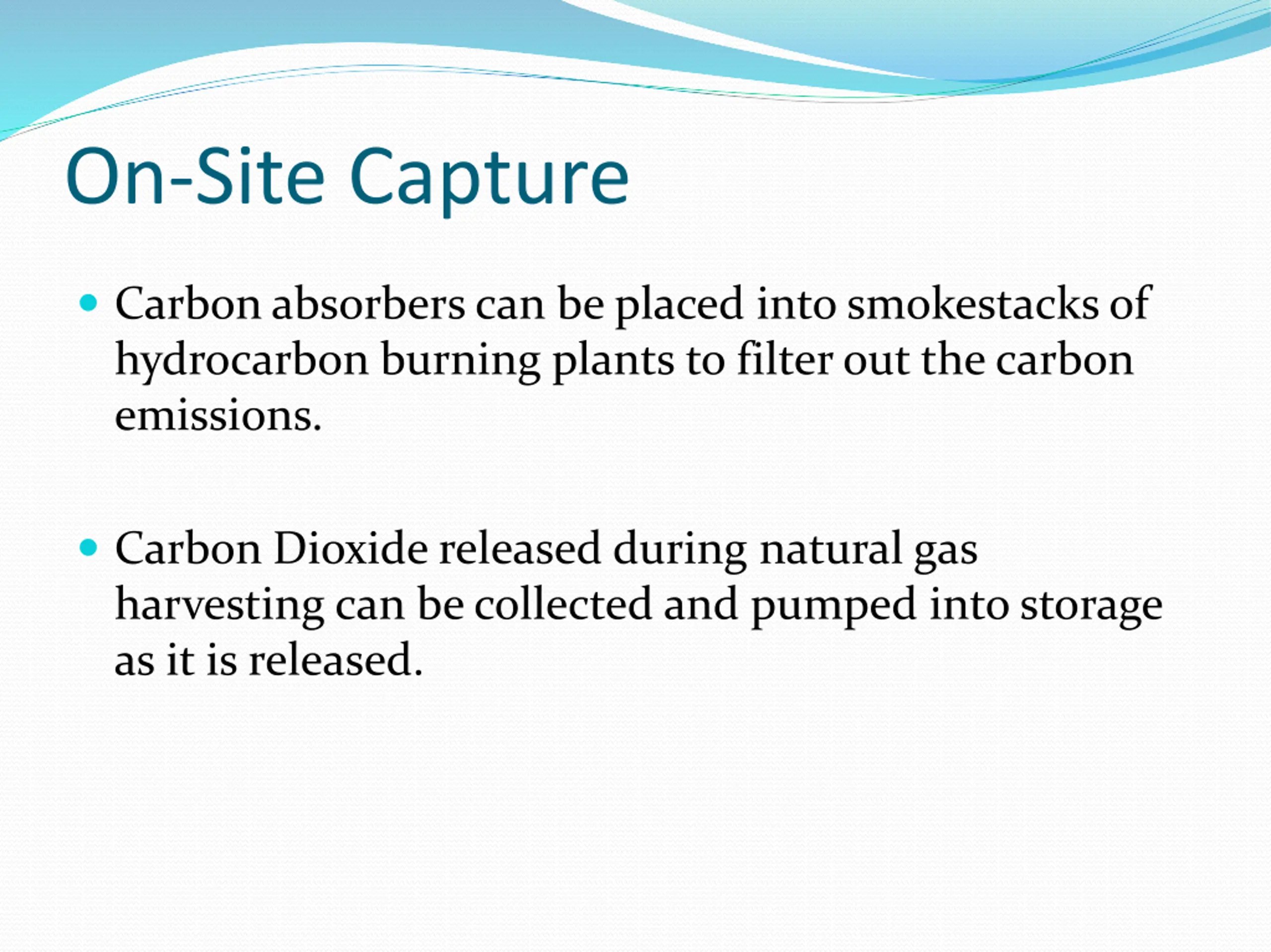 On-Site Capture Carbon absorbers can be placed into smokestacks of hydrocarbon burning plants to filter out the carbon emissions. Carbon Dioxide released during natural gas harvesting can be collected and pumped into storage as it is released.