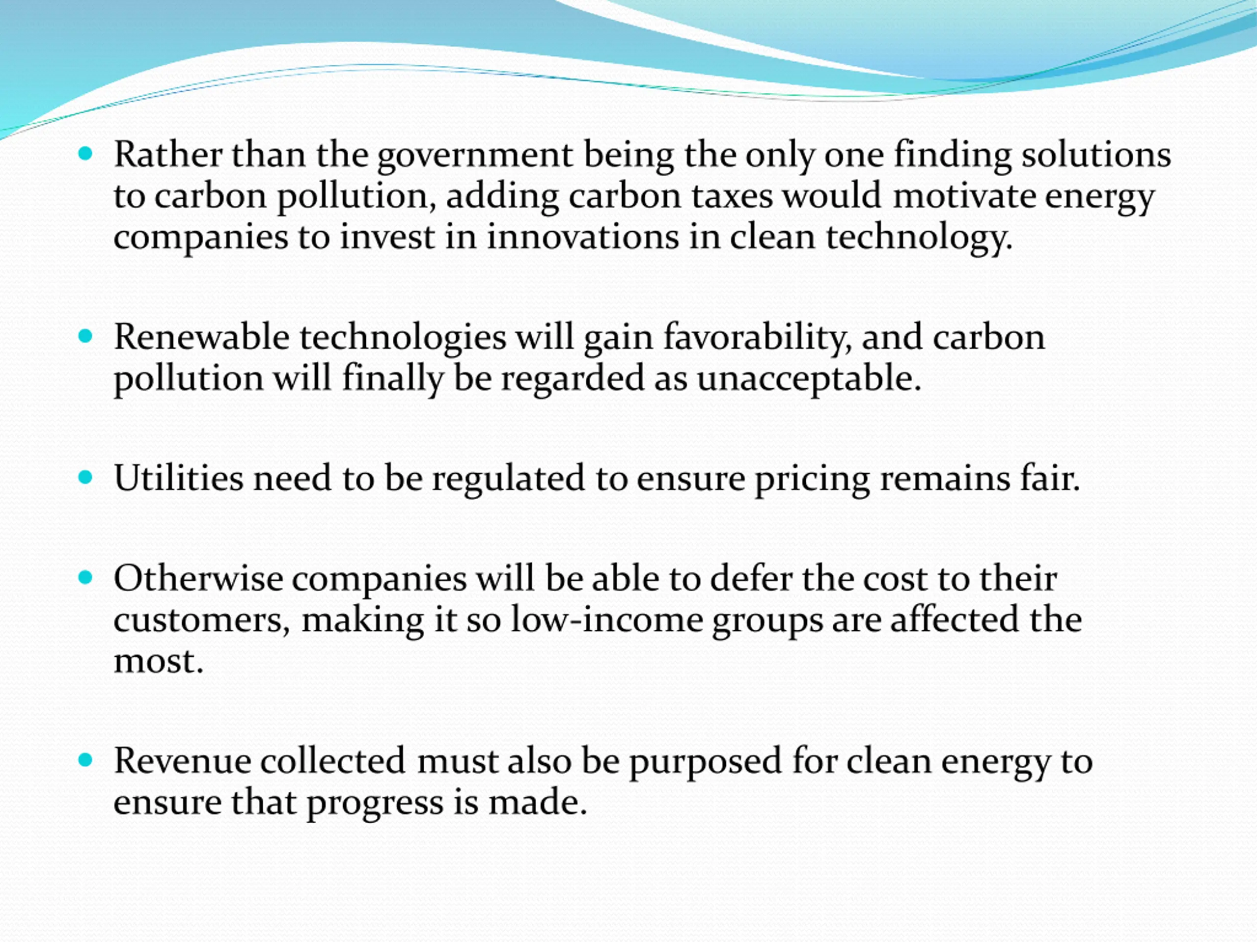 Rather than the government being the only one finding solutions to carbon pollution, adding carbon taxes would motivate energy companies to invest in innovations in clean technology. Renewable technologies will gain favorability, and carbon pollution will finally be regarded as unacceptable. Utilities need to be regulated to ensure pricing remains fair. Otherwise companies will be able to defer the cost to their customers, making it so low-income groups are affected the most. Revenue collected must also be purposed for clean energy to ensure that progress is made.