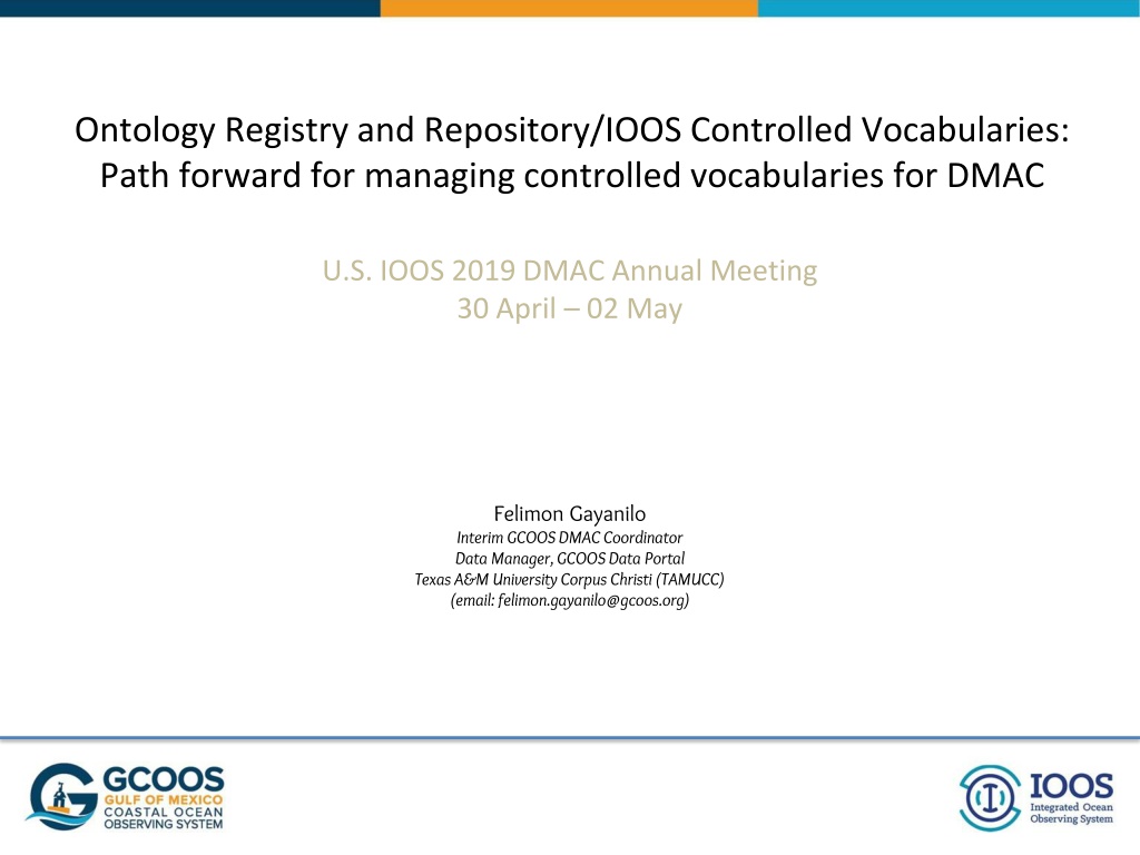 Ontology Registry and Repository/IOOS Controlled Vocabularies: Path forward for managing controlled vocabularies for DMAC U.S. IOOS 2019 DMAC Annual Meeting 30 April 02 May Felimon Gayanilo Interim GCOOS DMAC Coordinator Data Manager, GCOOS Data Portal Texas A&M University Corpus Christi (TAMUCC) (email: felimon.gayanilo@gcoos.org)