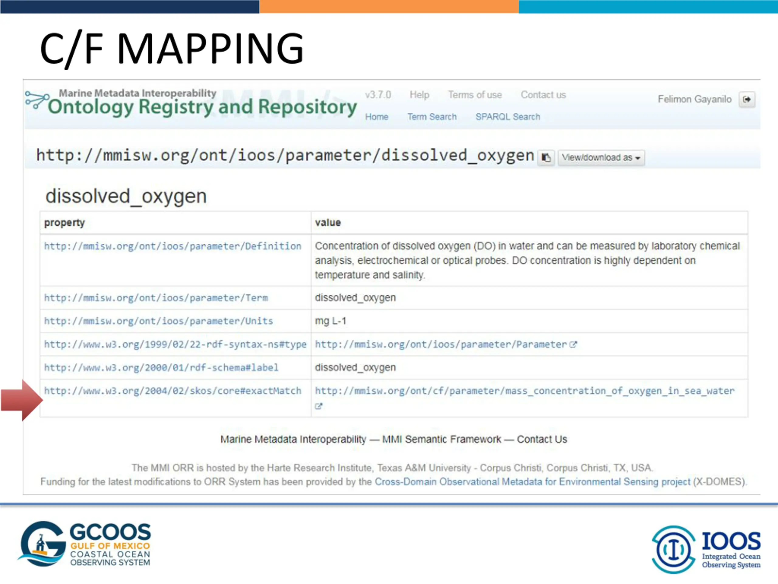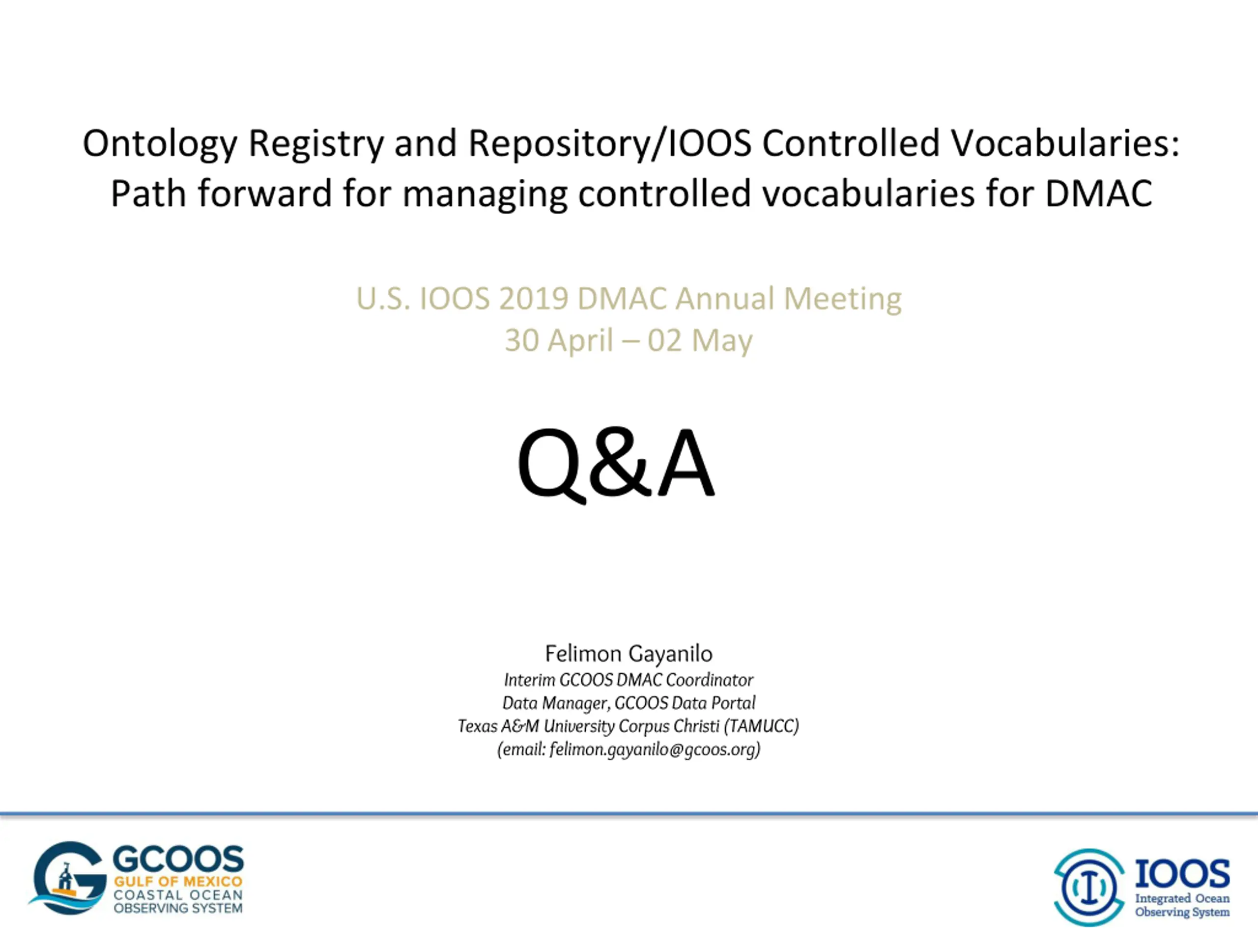 Ontology Registry and Repository/IOOS Controlled Vocabularies: Path forward for managing controlled vocabularies for DMAC U.S. IOOS 2019 DMAC Annual Meeting 30 April 02 May Q&A Felimon Gayanilo Interim GCOOS DMAC Coordinator Data Manager, GCOOS Data Portal Texas A&M University Corpus Christi (TAMUCC) (email: felimon.gayanilo@gcoos.org)