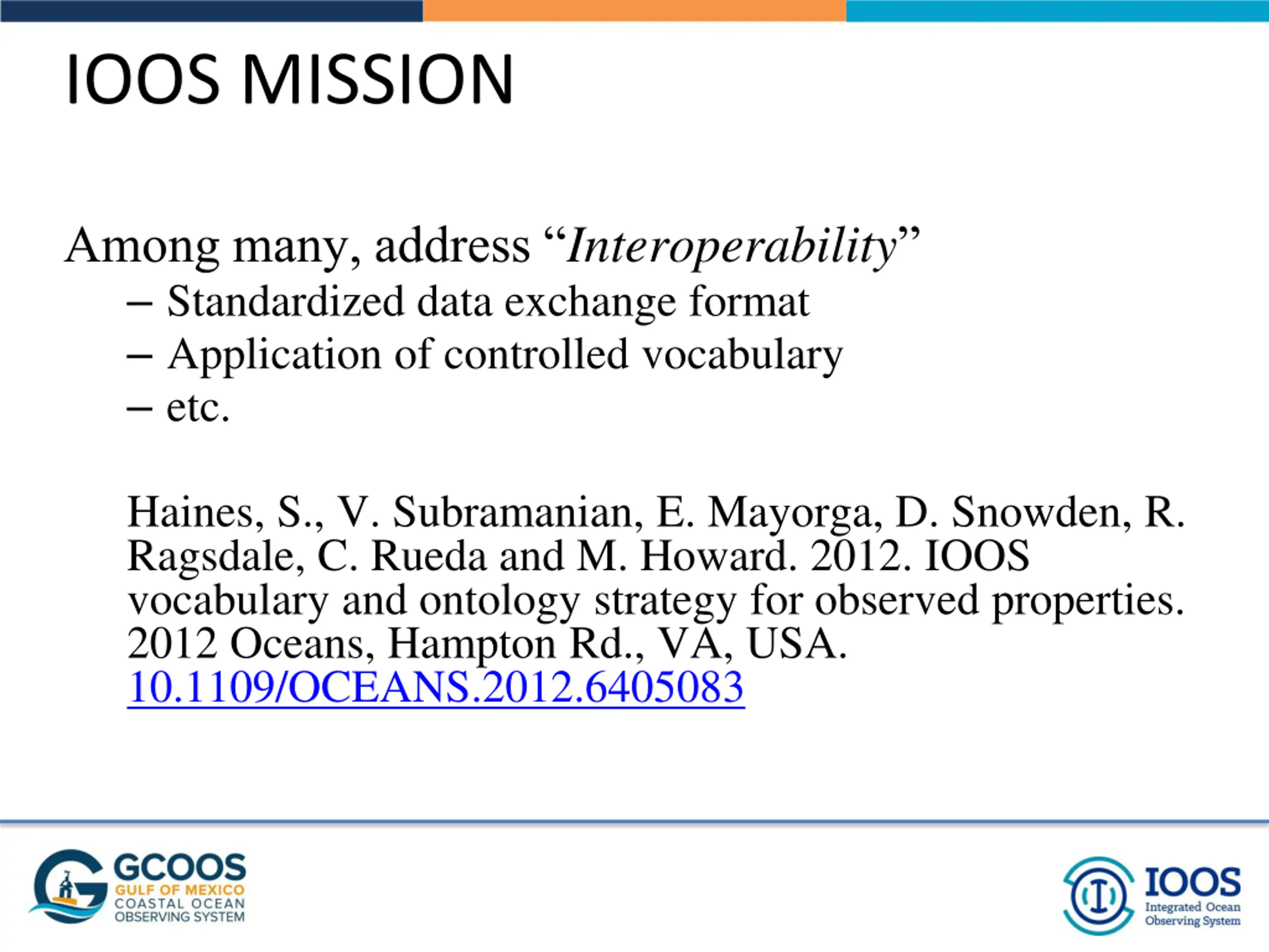 IOOS MISSION Among many, address Interoperability Standardized data exchange format Application of controlled vocabulary etc. Haines, S., V. Subramanian, E. Mayorga, D. Snowden, R. Ragsdale, C. Rueda and M. Howard. 2012. IOOS vocabulary and ontology strategy for observed properties. 2012 Oceans, Hampton Rd., VA, USA. 10.1109/OCEANS.2012.6405083