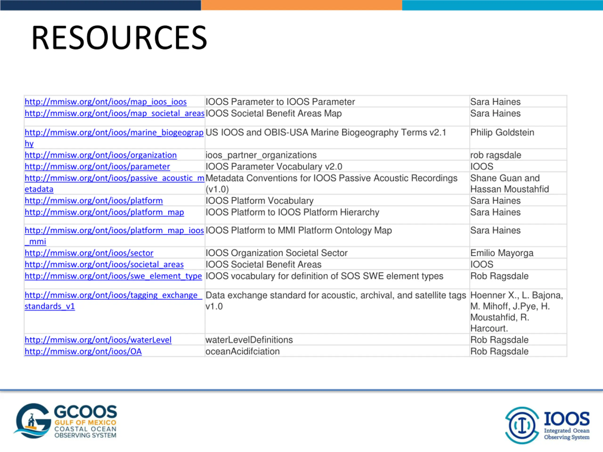 RESOURCES IOOS Parameter to IOOS Parameter Sara Haines Sara Haines http://mmisw.org/ont/ioos/map_ioos_ioos http://mmisw.org/ont/ioos/map_societal_areasIOOS Societal Benefit Areas Map US IOOS and OBIS-USA Marine Biogeography Terms v2.1 Philip Goldstein http://mmisw.org/ont/ioos/marine_biogeograp hy http://mmisw.org/ont/ioos/organization http://mmisw.org/ont/ioos/parameter http://mmisw.org/ont/ioos/passive_acoustic_m etadata http://mmisw.org/ont/ioos/platform http://mmisw.org/ont/ioos/platform_map ioos_partner_organizations IOOS Parameter Vocabulary v2.0 Metadata Conventions for IOOS Passive Acoustic Recordings (v1.0) IOOS Platform Vocabulary IOOS Platform to IOOS Platform Hierarchy rob ragsdale IOOS Shane Guan and Hassan Moustahfid Sara Haines Sara Haines IOOS Platform to MMI Platform Ontology Map Sara Haines http://mmisw.org/ont/ioos/platform_map_ioos _mmi http://mmisw.org/ont/ioos/sector http://mmisw.org/ont/ioos/societal_areas http://mmisw.org/ont/ioos/swe_element_type IOOS vocabulary for definition of SOS SWE element types IOOS Organization Societal Sector IOOS Societal Benefit Areas Emilio Mayorga IOOS Rob Ragsdale Data exchange standard for acoustic, archival, and satellite tags v1.0 Hoenner X., L. Bajona, M. Mihoff, J.Pye, H. Moustahfid, R. Harcourt. Rob Ragsdale Rob Ragsdale http://mmisw.org/ont/ioos/tagging_exchange_ standards_v1 waterLevelDefinitions oceanAcidifciation http://mmisw.org/ont/ioos/waterLevel http://mmisw.org/ont/ioos/OA