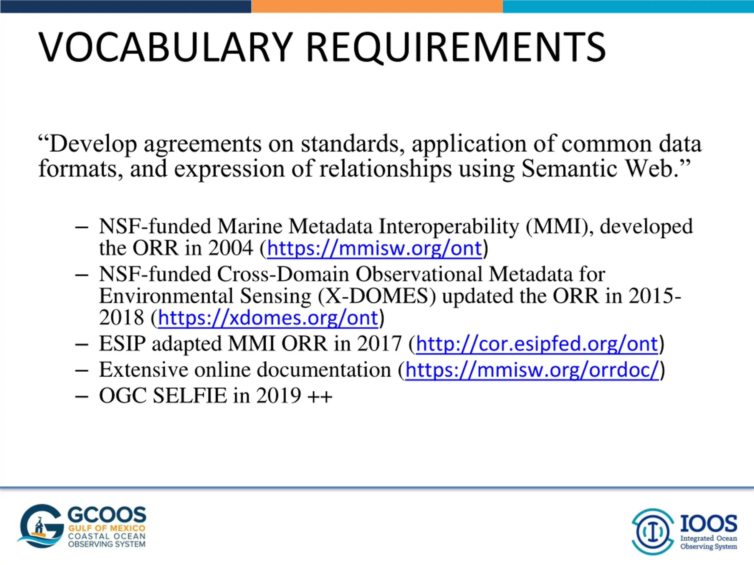 VOCABULARY REQUIREMENTS Develop agreements on standards, application of common data formats, and expression of relationships using Semantic Web. NSF-funded Marine Metadata Interoperability (MMI), developed the ORR in 2004 (https://mmisw.org/ont) NSF-funded Cross-Domain Observational Metadata for Environmental Sensing (X-DOMES) updated the ORR in 2015- 2018 (https://xdomes.org/ont) ESIP adapted MMI ORR in 2017 (http://cor.esipfed.org/ont) Extensive online documentation (https://mmisw.org/orrdoc/) OGC SELFIE in 2019 ++