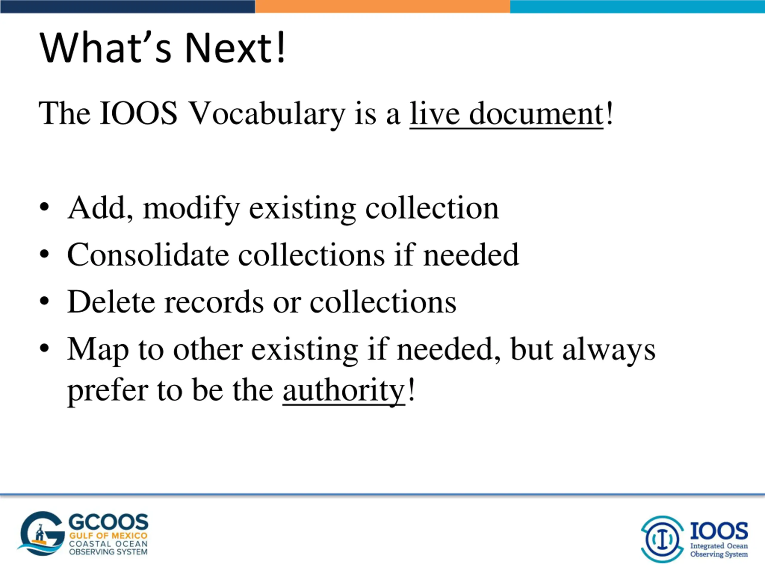Whats Next! The IOOS Vocabulary is a live document! Add, modify existing collection Consolidate collections if needed Delete records or collections Map to other existing if needed, but always prefer to be the authority!
