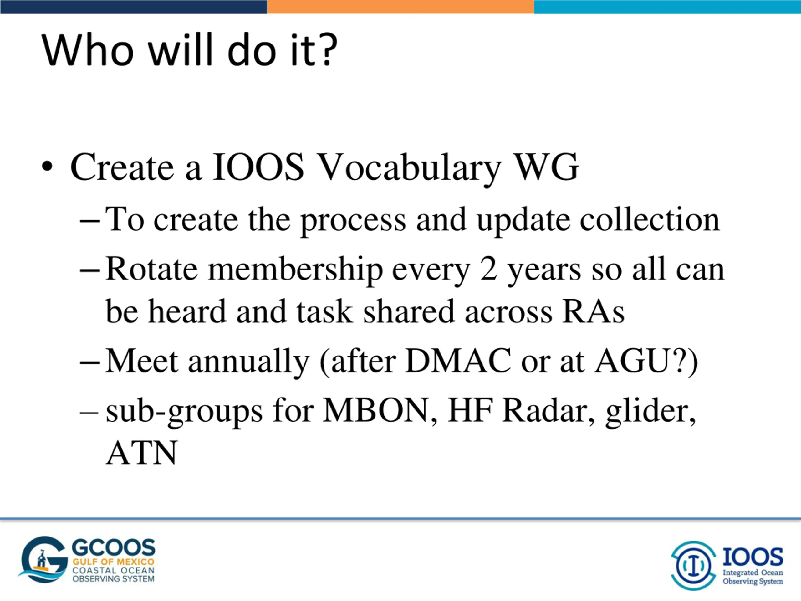 Who will do it? Create a IOOS Vocabulary WG To create the process and update collection Rotate membership every 2 years so all can be heard and task shared across RAs Meet annually (after DMAC or at AGU?) sub-groups for MBON, HF Radar, glider, ATN