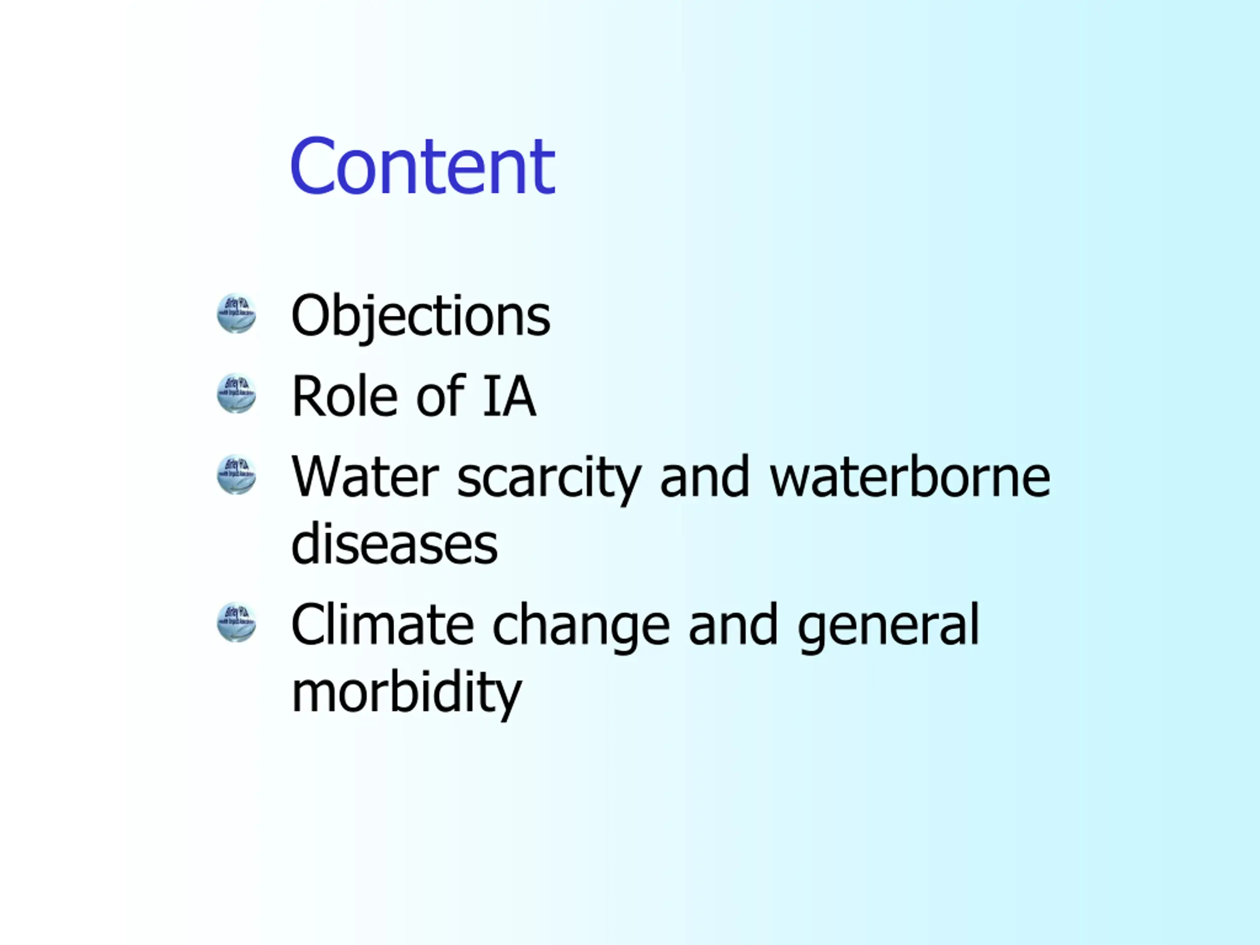 Content Objections Role of IA Water scarcity and waterborne diseases Climate change and general morbidity