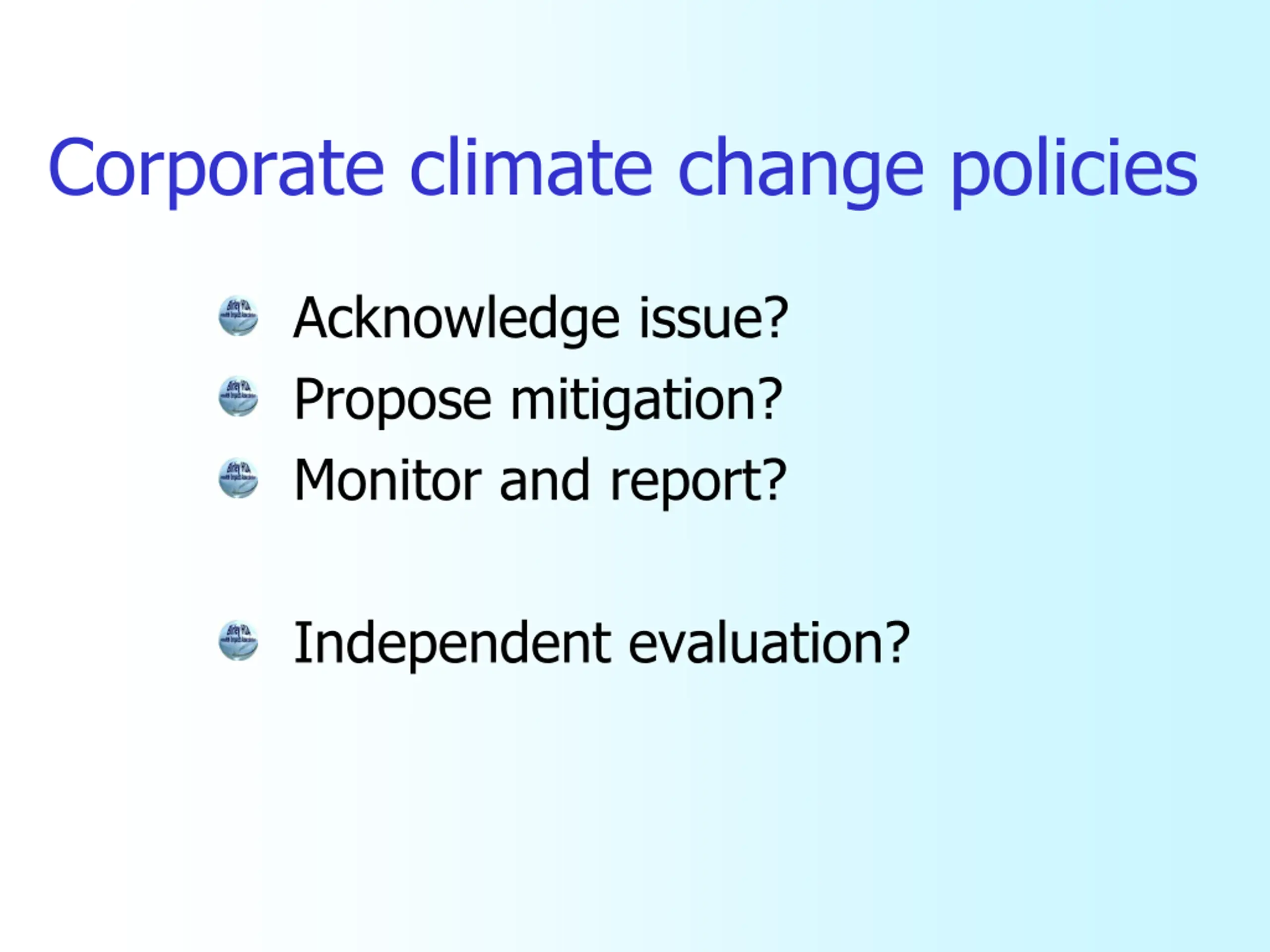 Corporate climate change policies Acknowledge issue? Propose mitigation? Monitor and report? Independent evaluation?