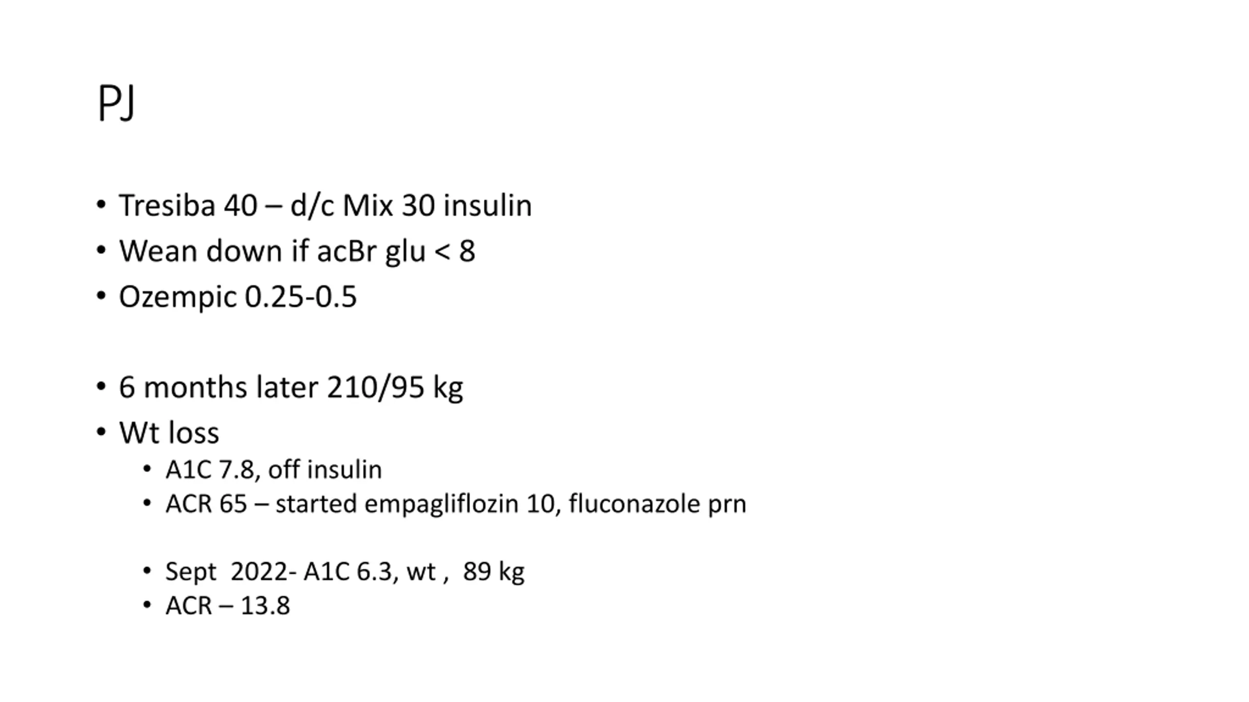 PJ Tresiba 40 d/c Mix 30 insulin Wean down if acBr glu < 8 Ozempic 0.25-0.5 6 months later 210/95 kg Wt loss A1C 7.8, off insulin ACR 65 started empagliflozin 10, fluconazole prn Sept 2022- A1C 6.3, wt , 89 kg ACR 13.8