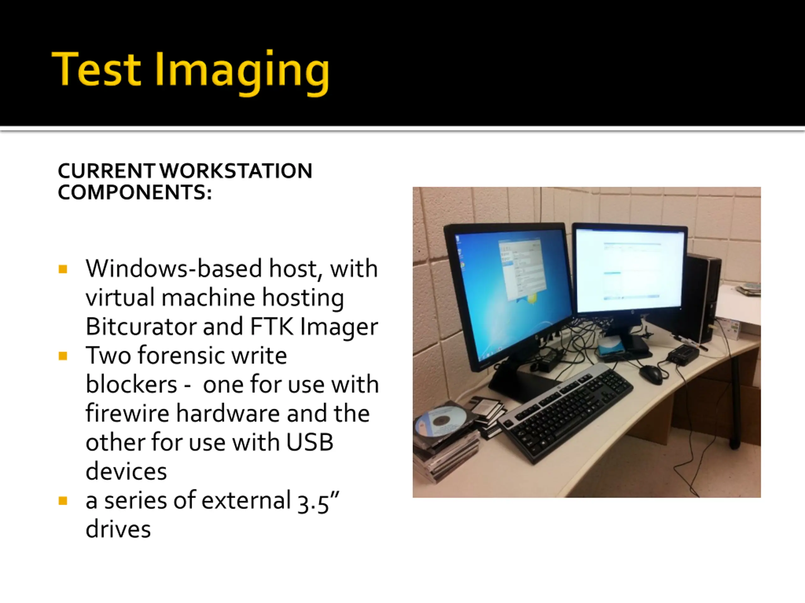 CURRENT WORKSTATION COMPONENTS: Windows-based host, with virtual machine hosting Bitcuratorand FTK Imager Two forensic write blockers - one for use with firewirehardware and the other for use with USB devices a series of external 3.5 drives