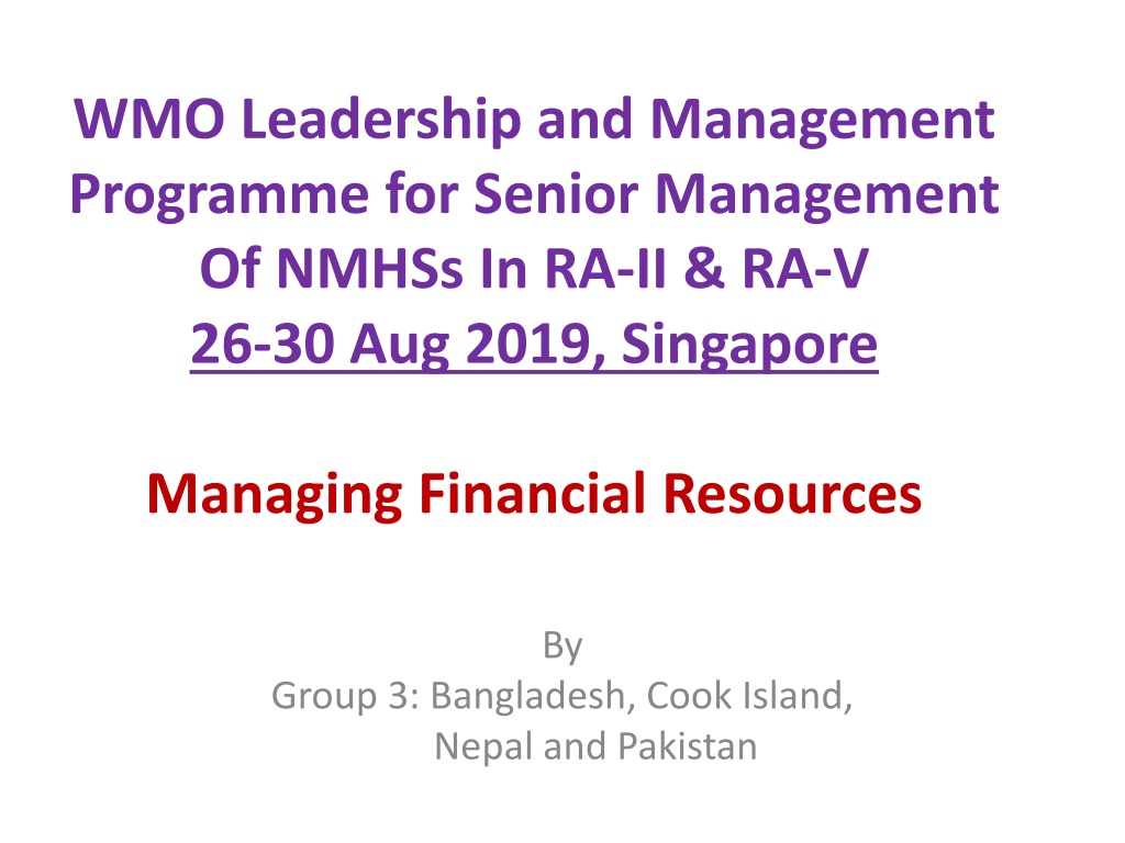 WMO Leadership and Management Programme for Senior Management Of NMHSs In RA-II & RA-V 26-30 Aug 2019, Singapore Managing Financial Resources By Group 3: Bangladesh, Cook Island, Nepal and Pakistan