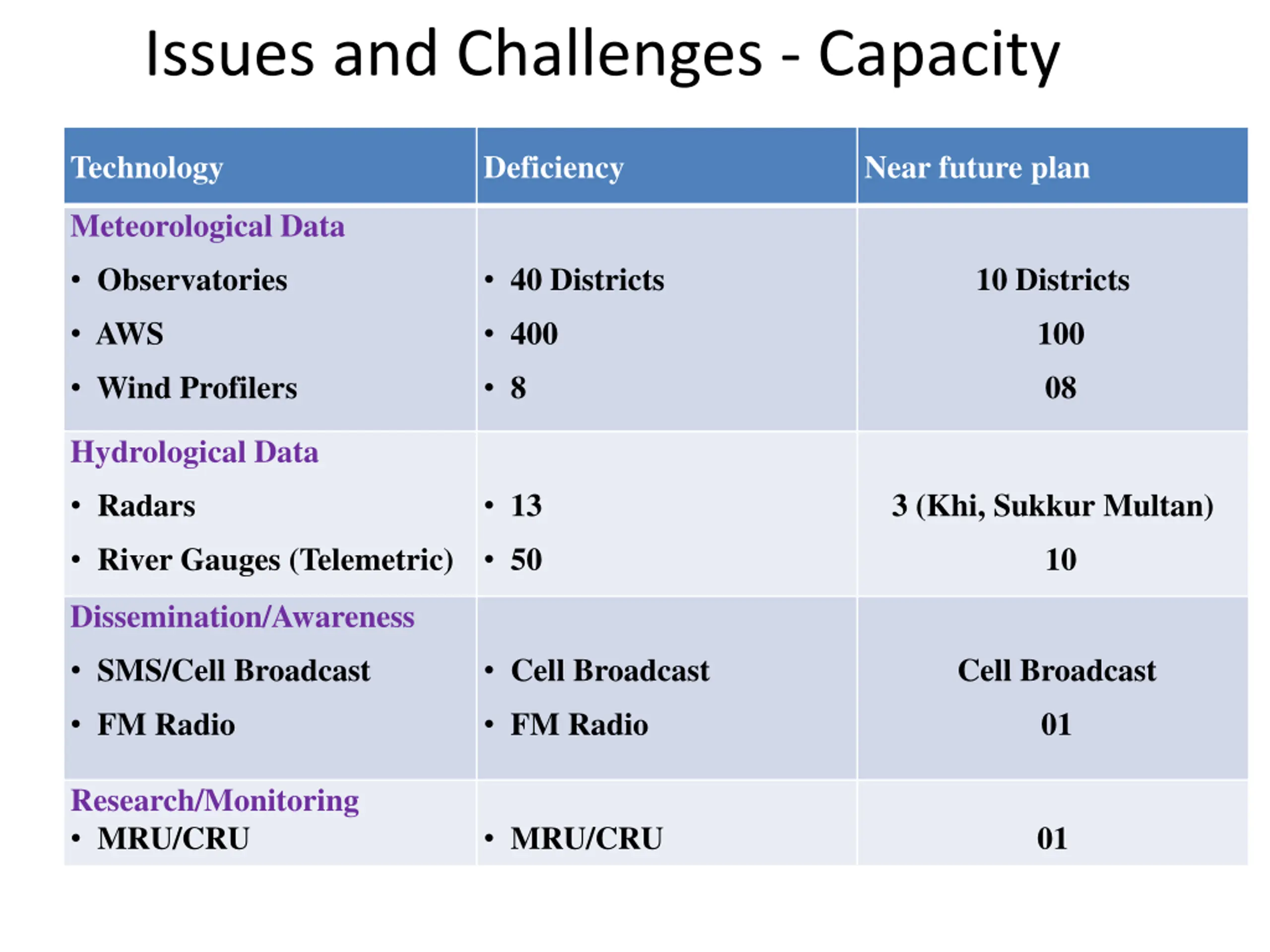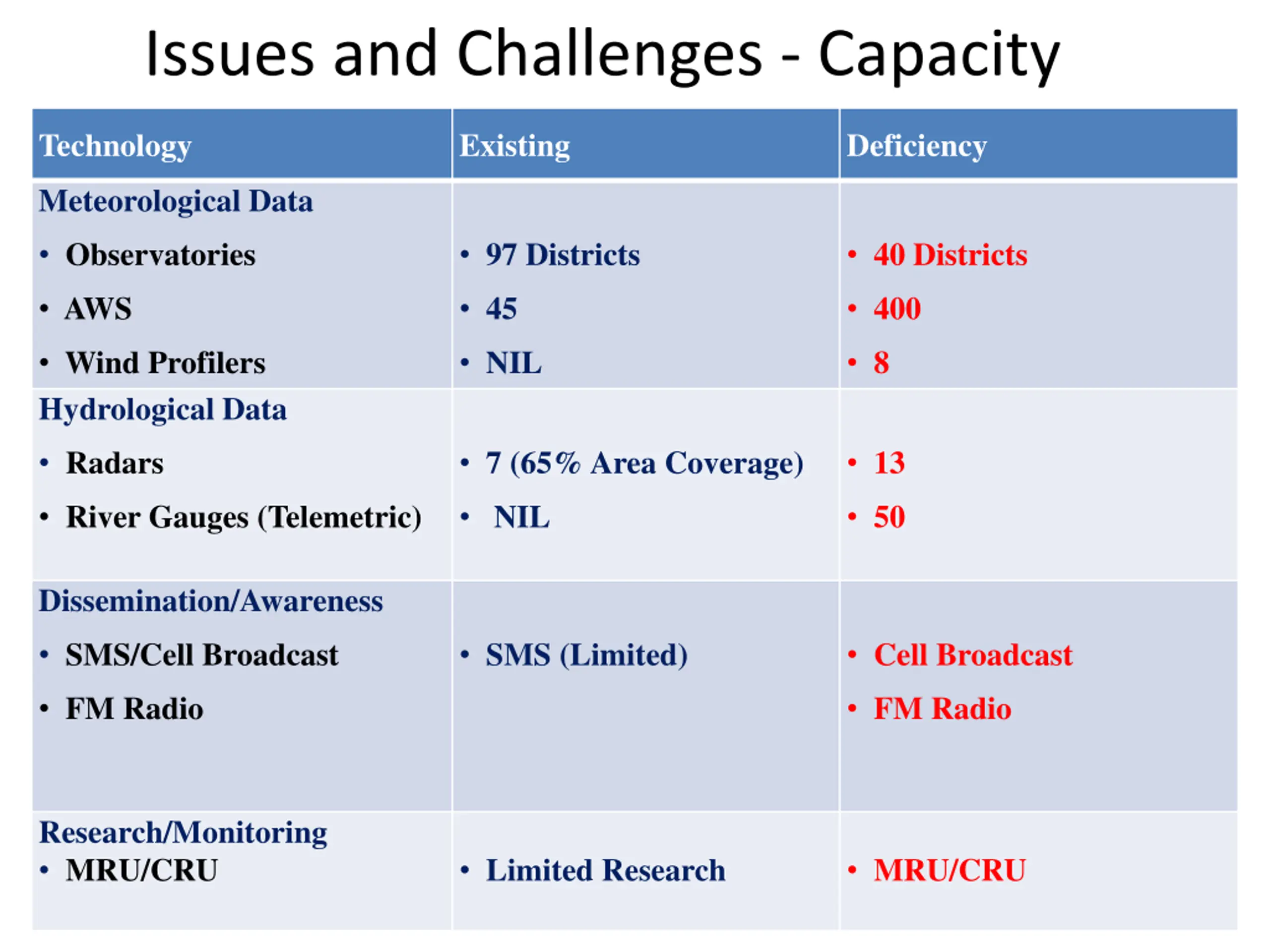 Issues and Challenges - Capacity Technology Existing Deficiency Meteorological Data Observatories 97 Districts 40 Districts AWS 45 400 Wind Profilers Hydrological Data NIL 8 Radars 7 (65% Area Coverage) 13 River Gauges (Telemetric) NIL 50 Dissemination/Awareness SMS/Cell Broadcast SMS (Limited) Cell Broadcast FM Radio FM Radio Research/Monitoring MRU/CRU Limited Research MRU/CRU