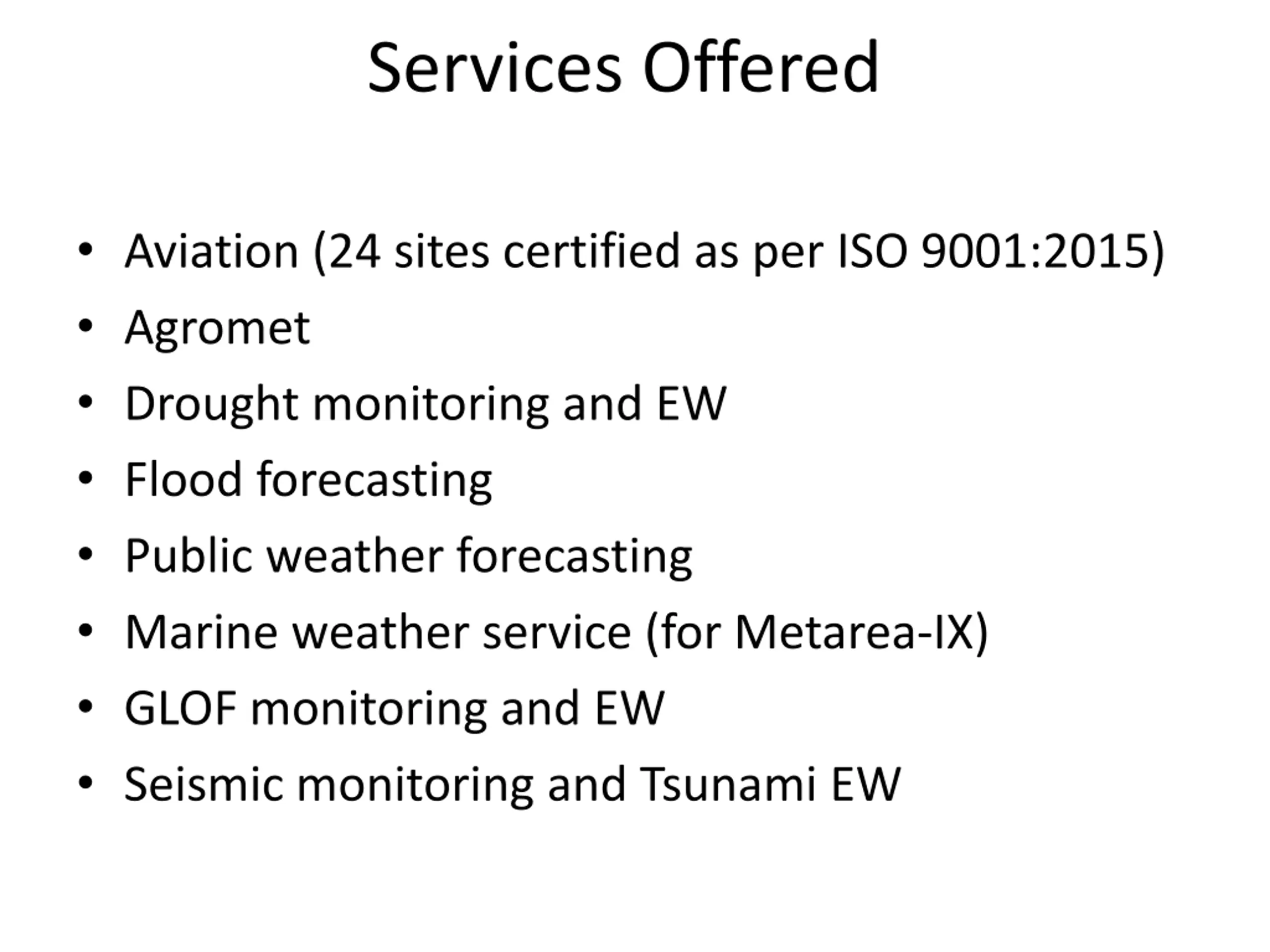 Services Offered Aviation (24 sites certified as per ISO 9001:2015) Agromet Drought monitoring and EW Flood forecasting Public weather forecasting Marine weather service (for Metarea-IX) GLOF monitoring and EW Seismic monitoring and Tsunami EW