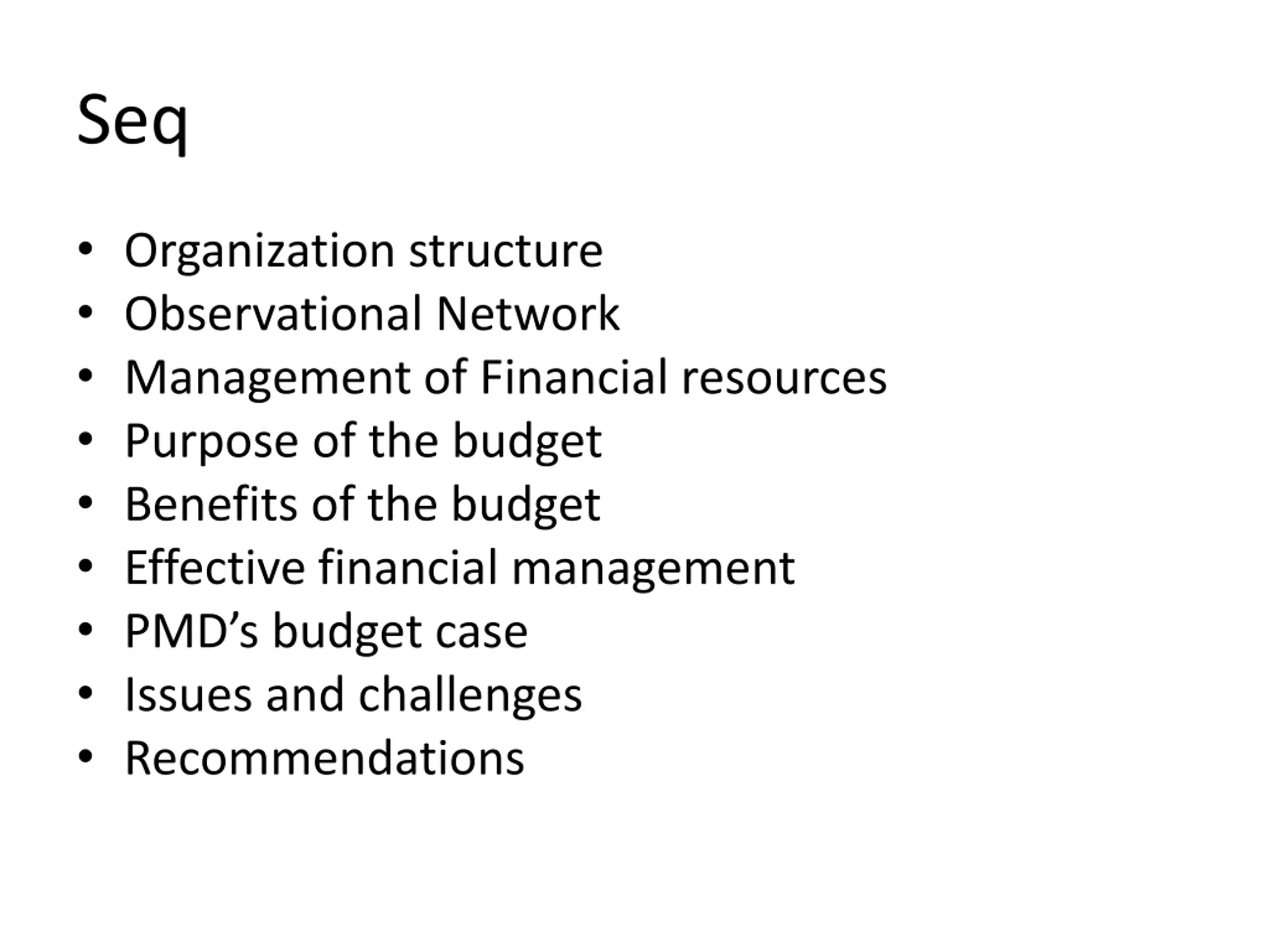 Seq Organization structure Observational Network Management of Financial resources Purpose of the budget Benefits of the budget Effective financial management PMD s budget case Issues and challenges Recommendations