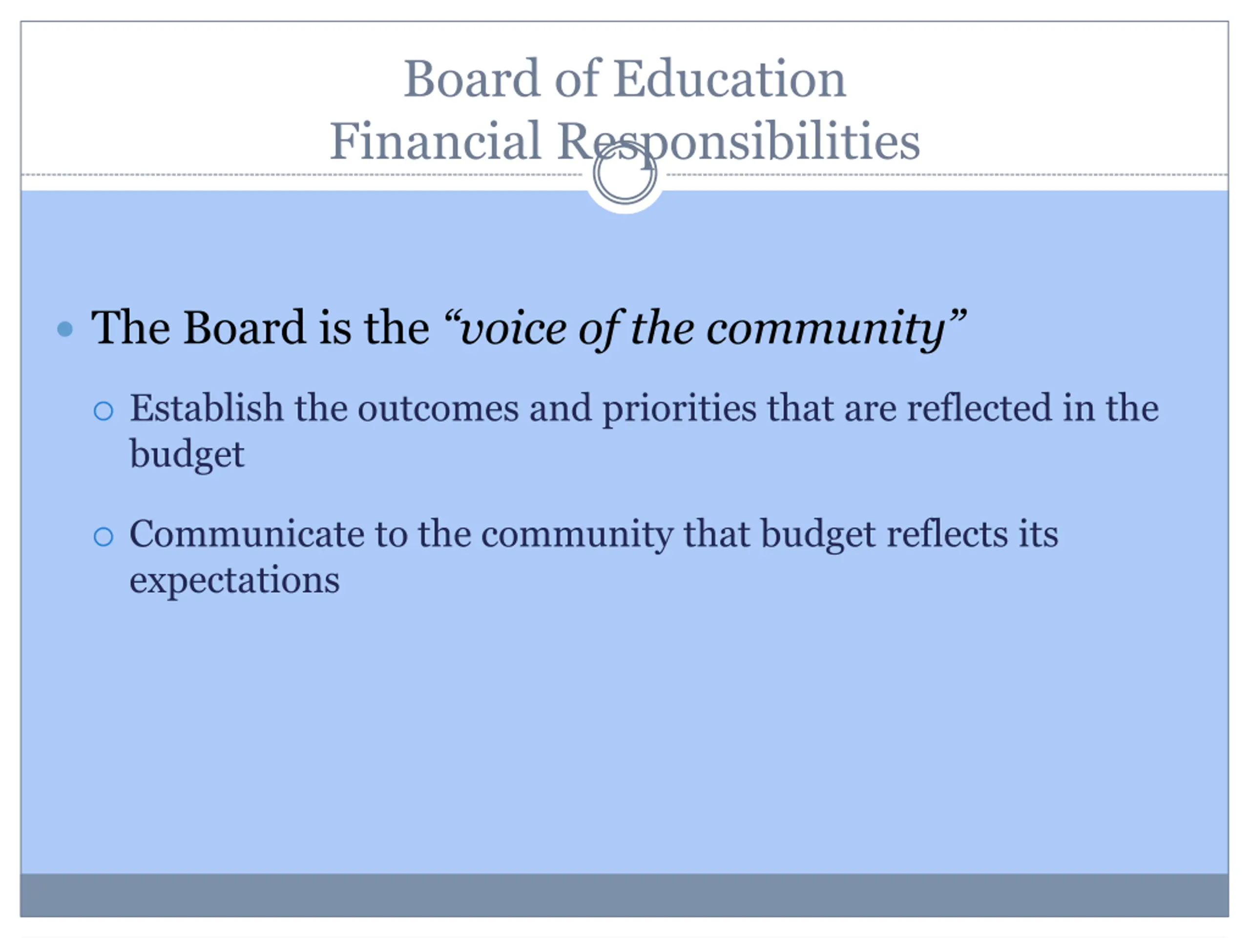 Board of Education Financial Responsibilities The Board is the voice of the community Establish the outcomes and priorities that are reflected in the budget Communicate to the community that budget reflects its expectations