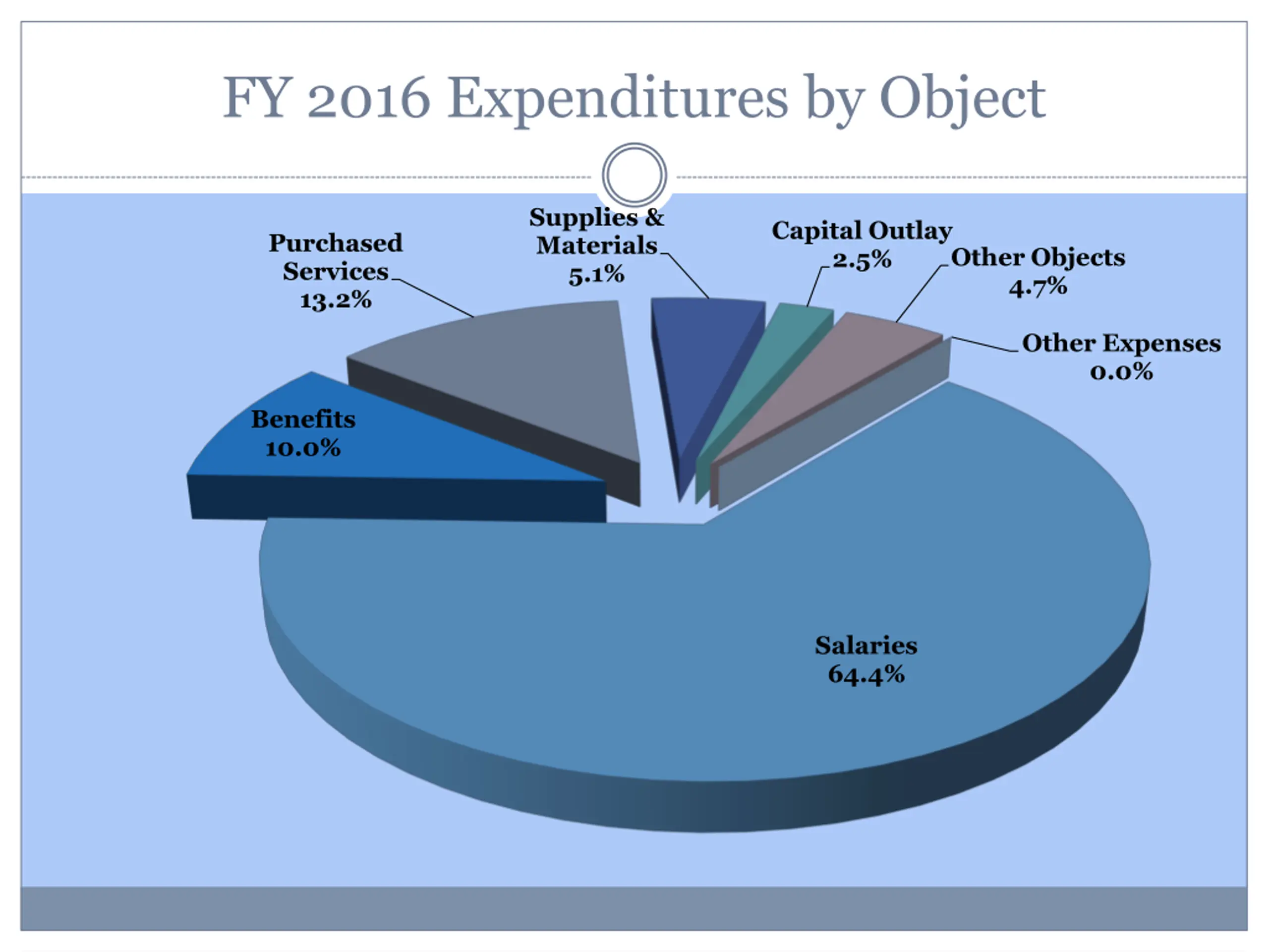FY 2016 Expenditures by Object Supplies & Materials 5.1% Capital Outlay 2.5% Purchased Services 13.2% Other Objects 4.7% Other Expenses 0.0% Benefits 10.0% Salaries 64.4%