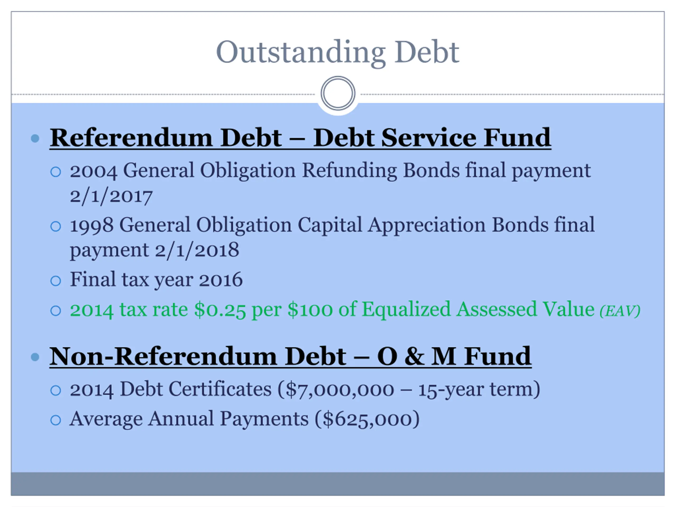 Outstanding Debt Referendum Debt Debt Service Fund 2004 General Obligation Refunding Bonds final payment 2/1/2017 1998 General Obligation Capital Appreciation Bonds final payment 2/1/2018 Final tax year 2016 2014 tax rate $0.25 per $100 of Equalized Assessed Value (EAV) Non-Referendum Debt O & M Fund 2014 Debt Certificates ($7,000,000 15-year term) Average Annual Payments ($625,000)