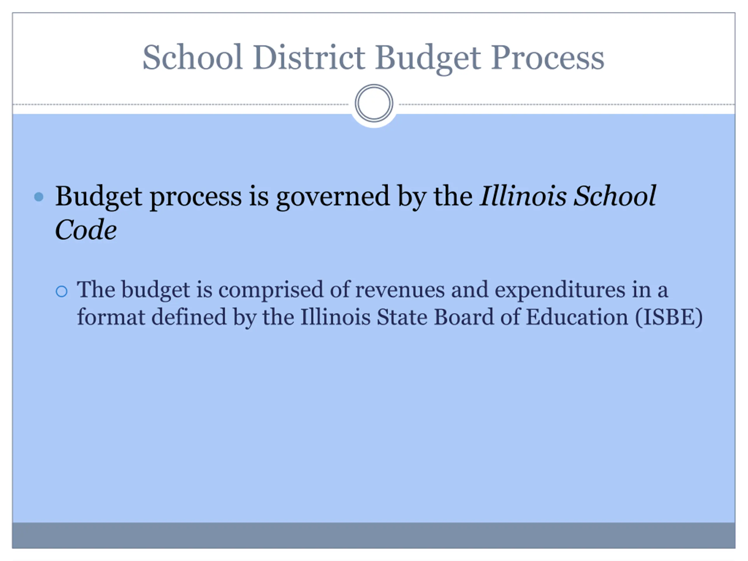 School District Budget Process Budget process is governed by the Illinois School Code The budget is comprised of revenues and expenditures in a format defined by the Illinois State Board of Education (ISBE)