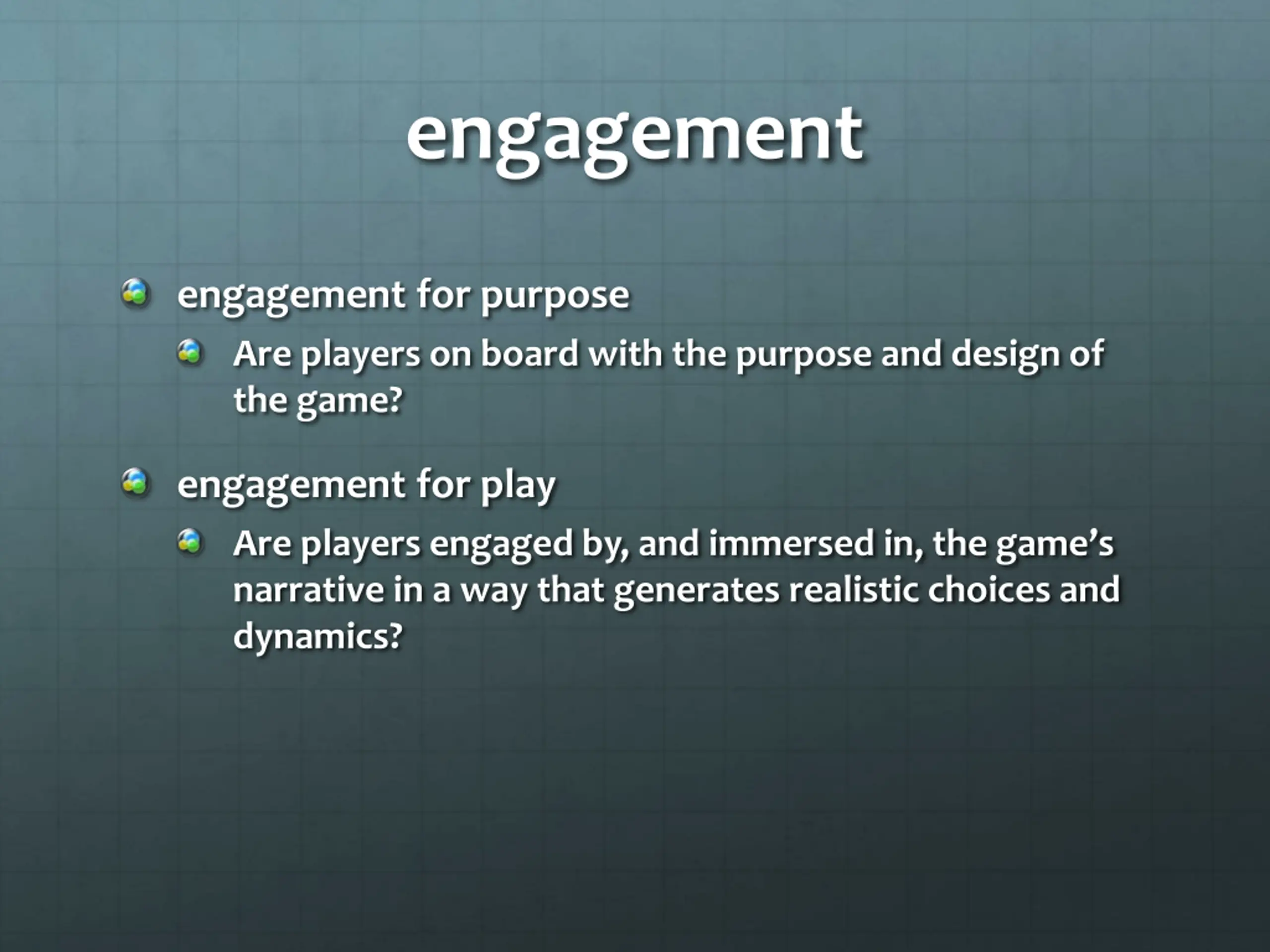 engagement engagement for purpose Are players on board with the purpose and design of the game? engagement for play Are players engaged by, and immersed in, the game s narrative in a way that generates realistic choices and dynamics?