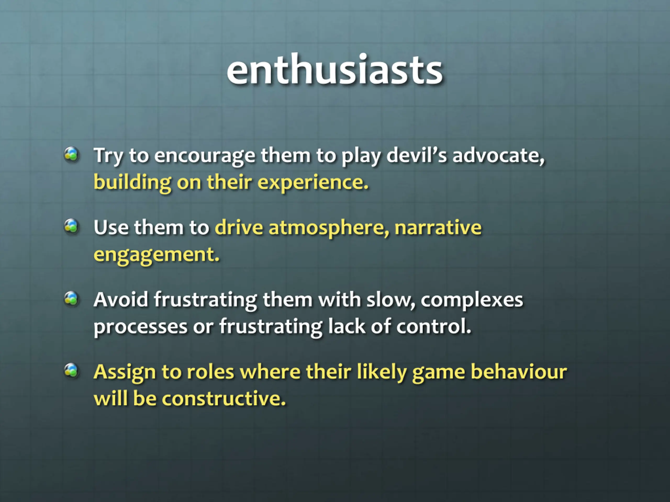 enthusiasts Try to encourage them to play devil s advocate, building on their experience. Use them to drive atmosphere, narrative engagement. Avoid frustrating them with slow, complexes processes or frustrating lack of control. Assign to roles where their likely game behaviour will be constructive.