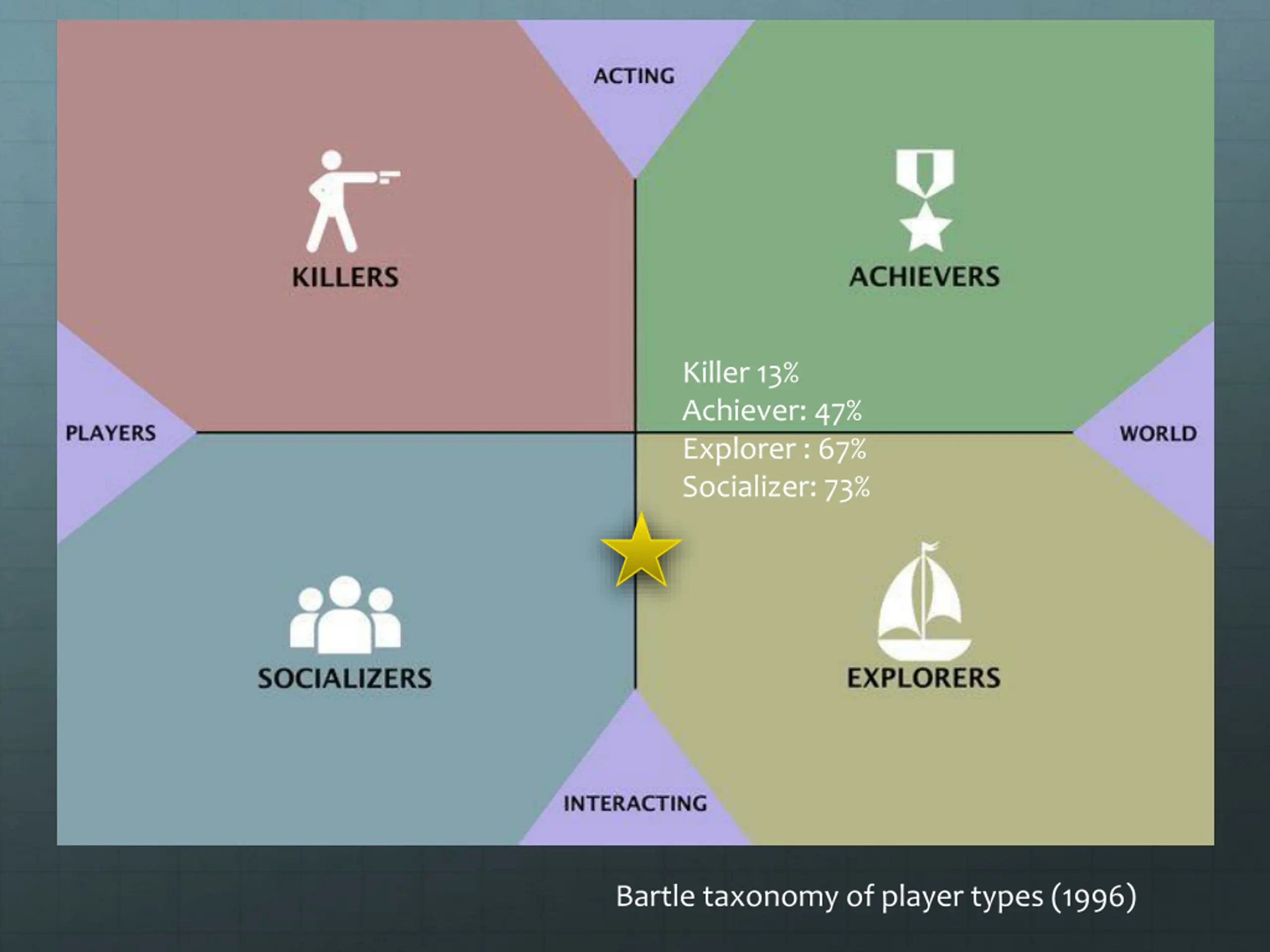 Killer 13% Achiever: 47% Explorer : 67% Socializer: 73% Bartle taxonomy of player types (1996)