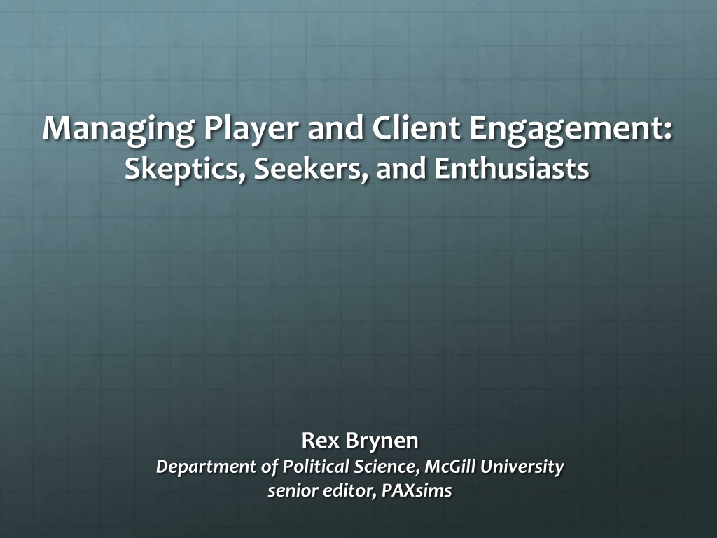 Managing Player and Client Engagement: Skeptics, Seekers, and Enthusiasts Rex Brynen Department of Political Science, McGill University senior editor, PAXsims