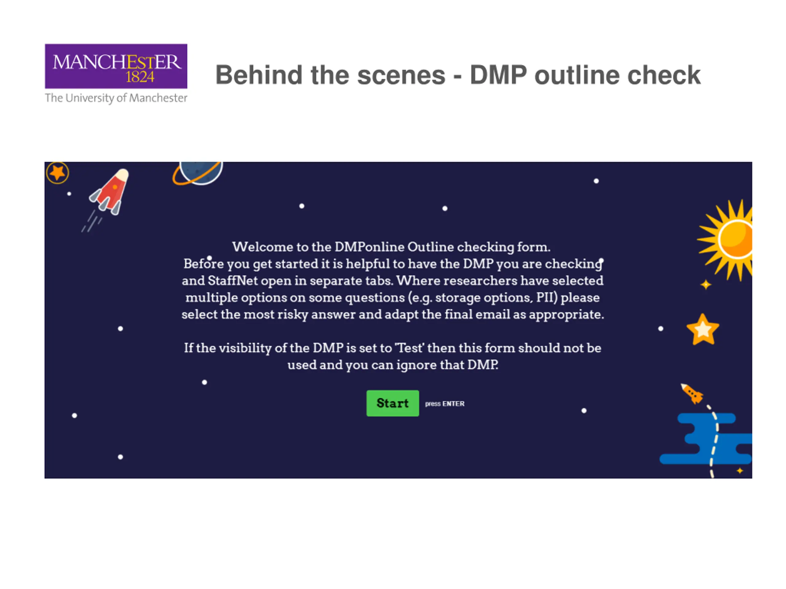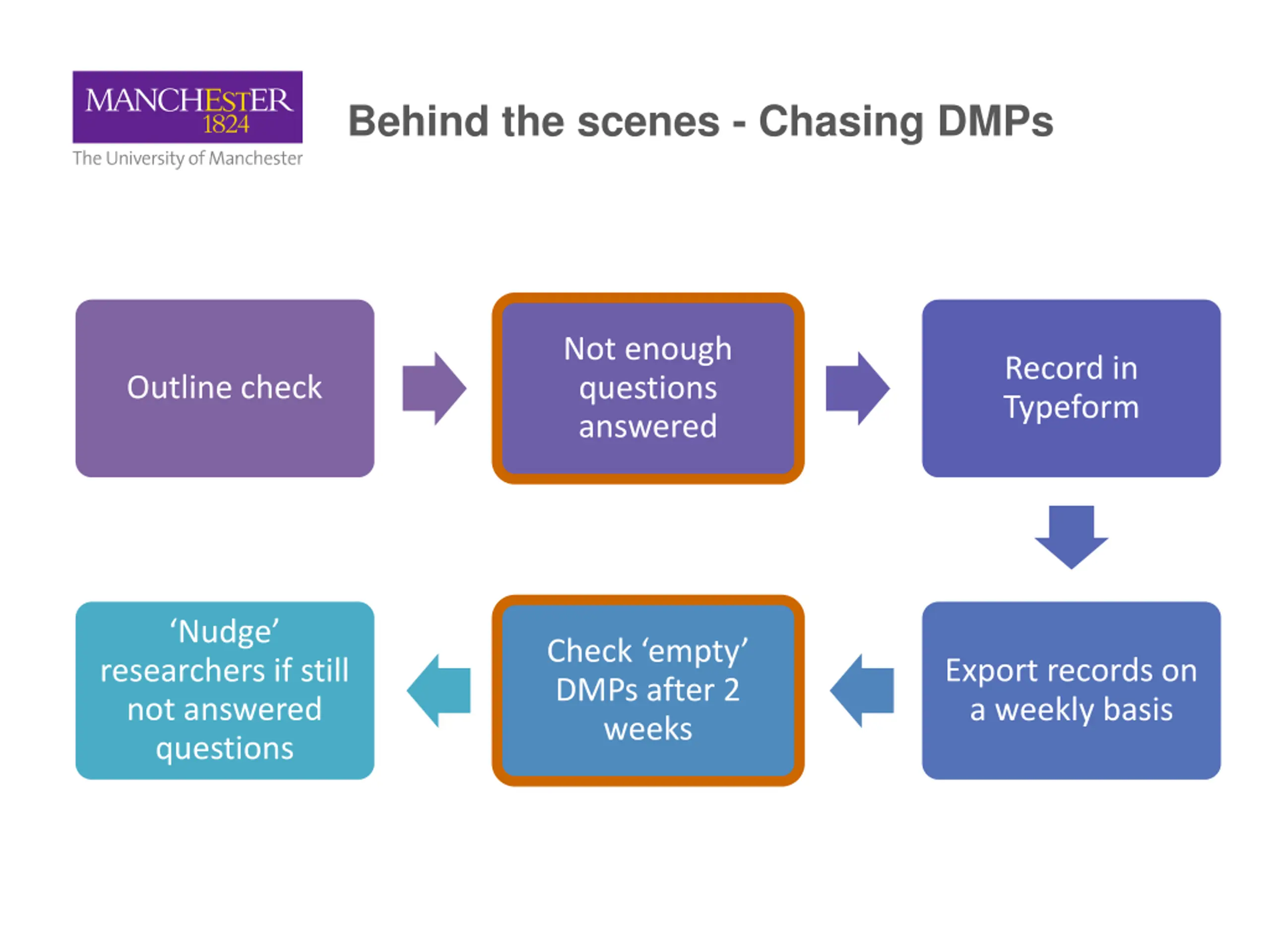 Behind the scenes - Chasing DMPs Not enough questions answered Record in Typeform Outline check Nudge Check empty DMPs after 2 weeks Export records on a weekly basis researchers if still not answered questions