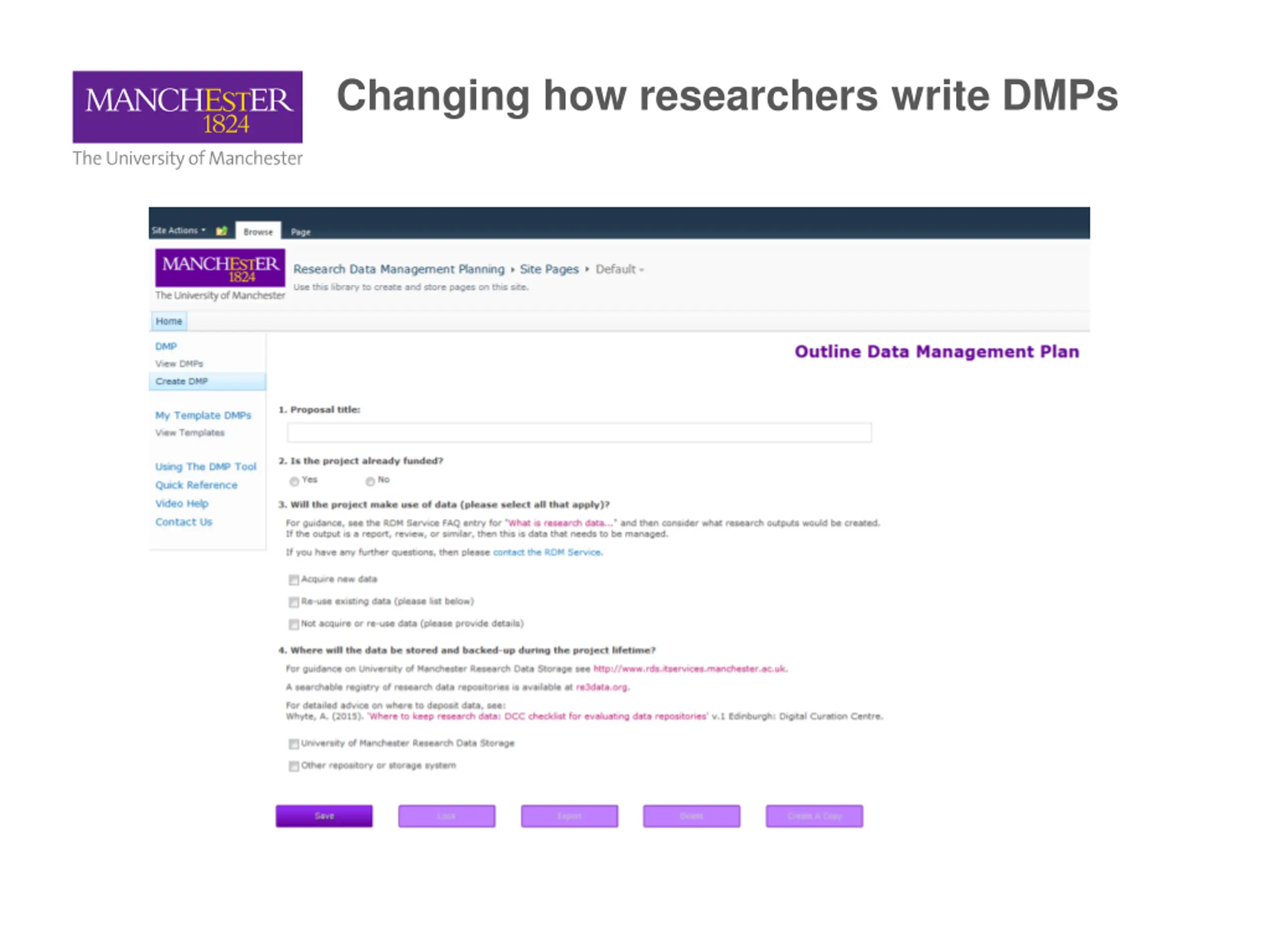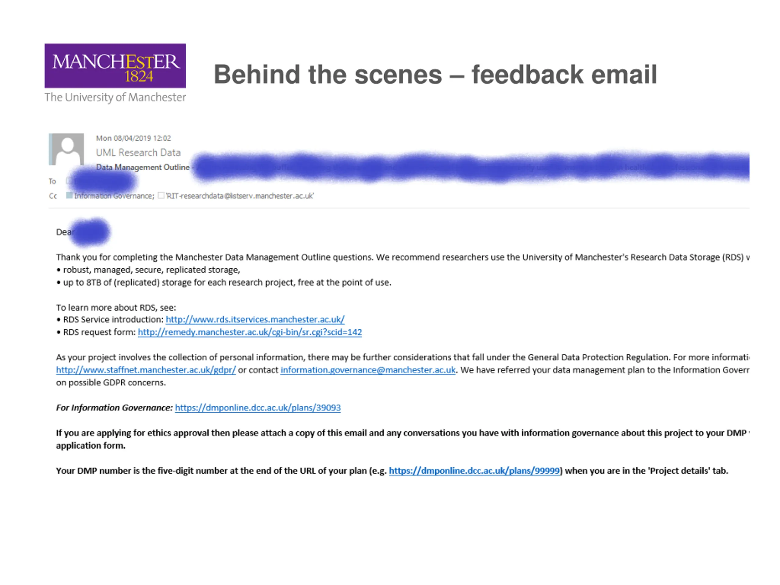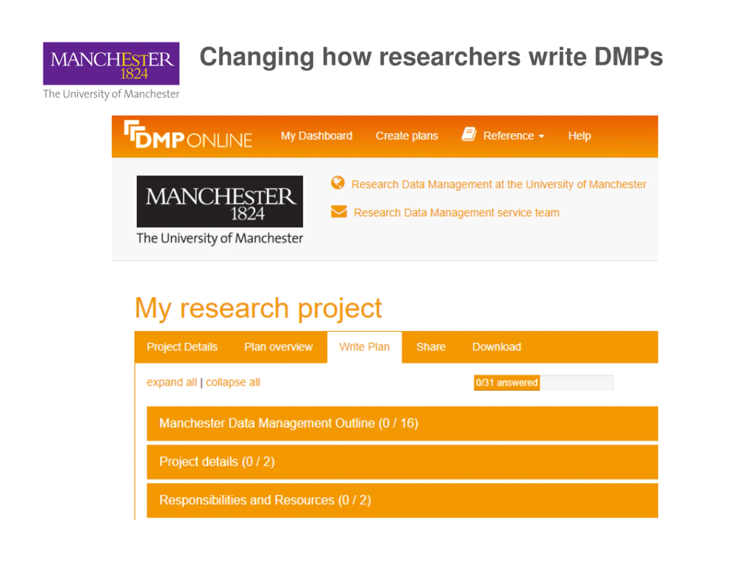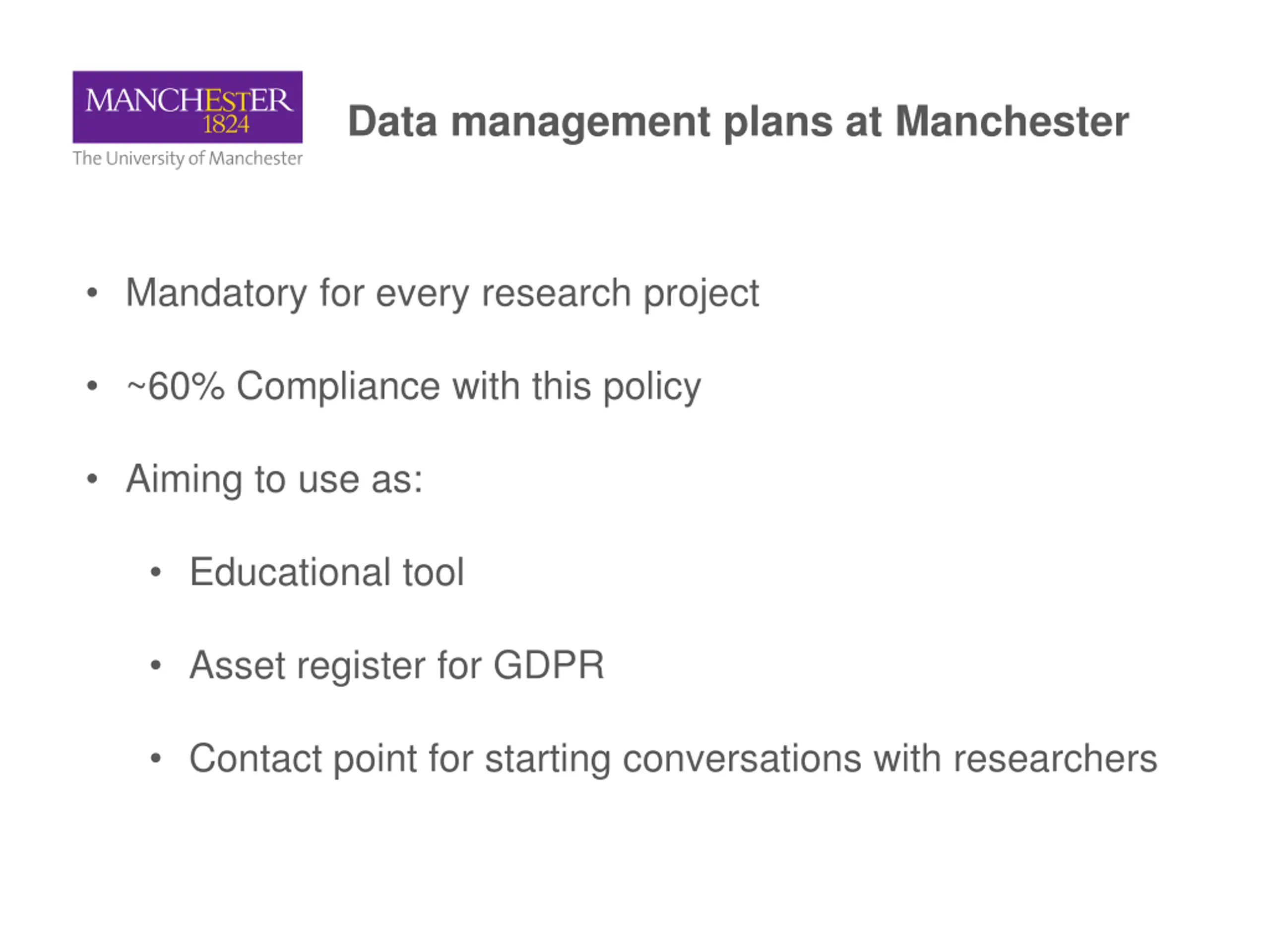 Data management plans at Manchester Mandatory for every research project ~60% Compliance with this policy Aiming to use as: Educational tool Asset register for GDPR Contact point for starting conversations with researchers